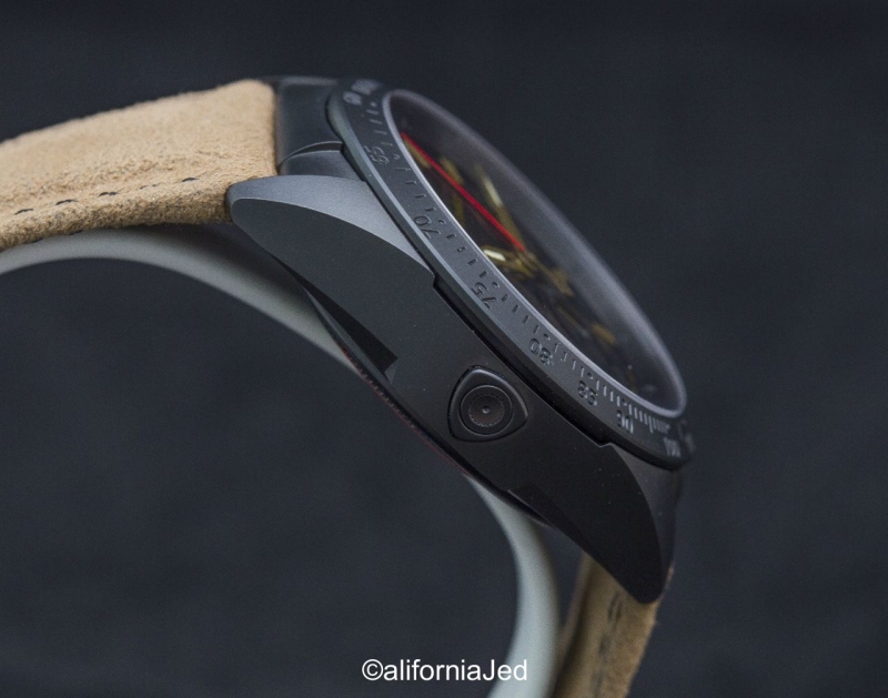 Ah, yes, the other version. I was immediately attracted to the beefy matte black ceramic case and bezel of the Black Shield, despite all the red. And right next to this black and red beast in the display case was the lesser photographed version, with bronze markers and a nicely sueded brown strap on a sturdy black deployant. There was still a touch of red on the dial, just enough, the large seconds counter, to form a nice, subtle nod to racing and to Ducati. And it contrasted very nicely against the black dial and the bronze markers.