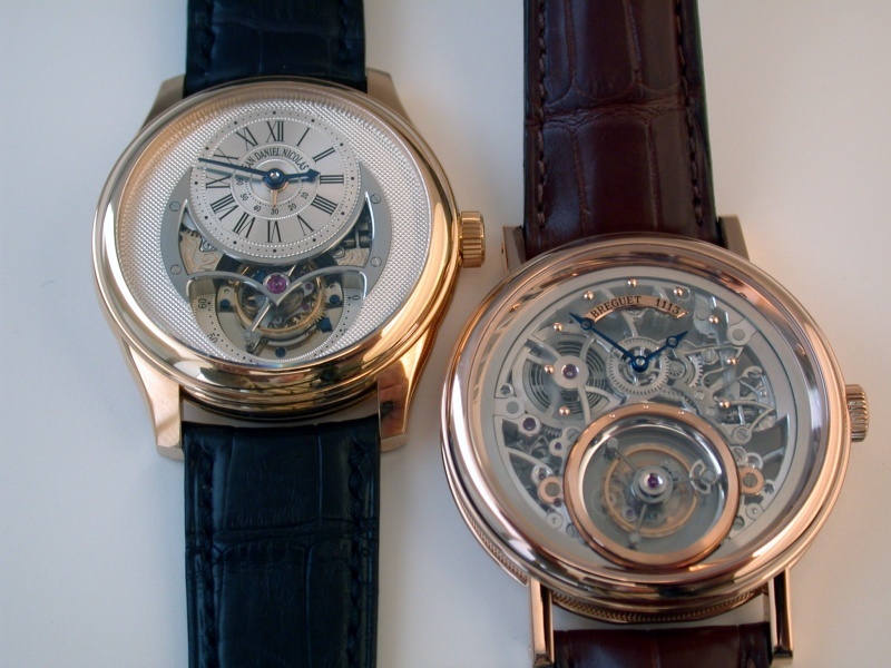 Side by side: Nice family resemblance! The Jean Daniel Nicolas on the left is designed and manufactured by Daniel Roth, who was technical director at Breguet when Breguet developed, with Lemania, its tourbillon movement in thew 1980's. The Breguet Tourbil...