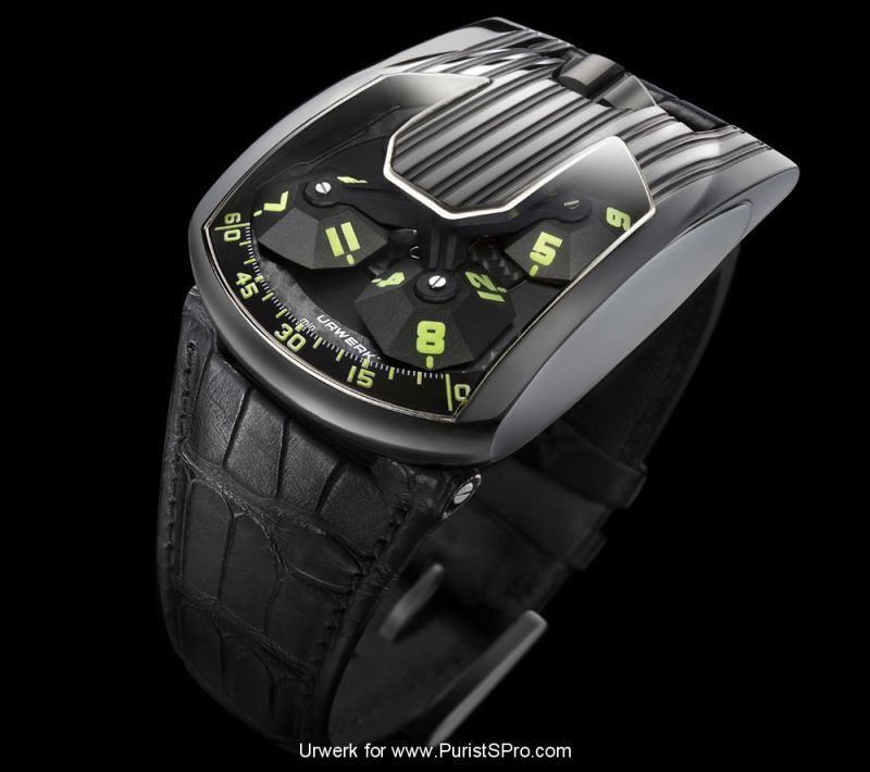 The birth of URWERK’s «Black» limited editions goes back to 1999 with the presentation of a special version of URWERK’s very first watch, - the UR102 – which was clothed in black and called « Night Watch ». The model quickly became a collector’s item, and no wonder, its aluminium case and platinum base may be considered run of the mill fusion today, but it was proudly revolutionary for its time. The concept was revived in 2006 with the now mythical « Black Bird », a creation with combat aesthetics and a name derived from military aviation. The « Black Shark » followed in 2007.