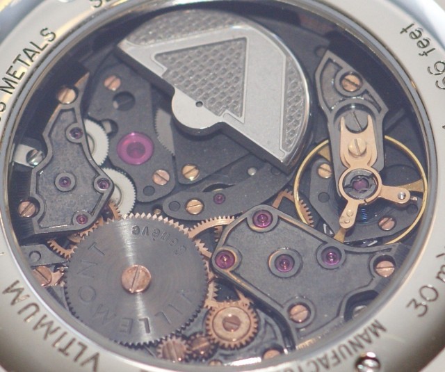 The winding efficency of the microrotor is also disappointing. Despite upgrading the movement with a heavier platinum rotor, wearing the Vltime all day (fourteen working hours) only gives the watch a power reserve of 26 hours on average. This inefficient power transmission is due to Buren's original design which allowed the movement to be wound bidirectionnally but introduced more friction as a result of the engineered solution. Like all microrotor movements, the smaller rotor has a higher breaking point before it starts to wind and this also contributes to the decreased winding efficency.