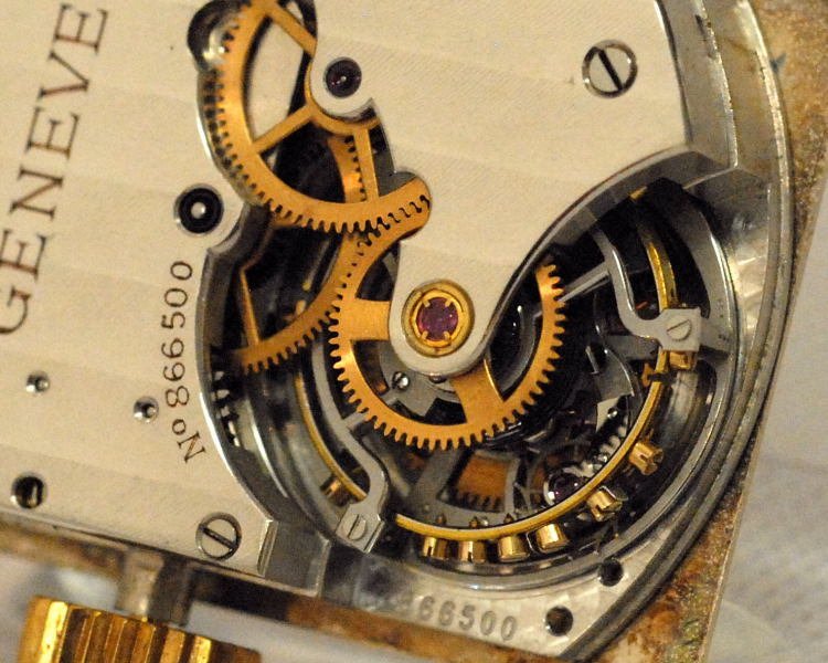 In the mid 1950’s, Andre Bornand was the Professor of Escapement Design at Geneva and also working with Patek Phillipe. The 3834T was the end of a series of movements that won the Observatory Competition in 1958 for its class. The movements were then cased later on and apparently sold in 1989 for $440 (I cry a lot these days). In detail, the 34T is a rectangular, 50 second tourbillon, Guillaume balance, duofix shock-absorbers, freesprung Breguet overcoil, straight line lever escapement, 21,600 vph, 57 hour reserve. The off-centre second hand is mounted on extra wheel off last arbor of the train, at 8 o'clock.