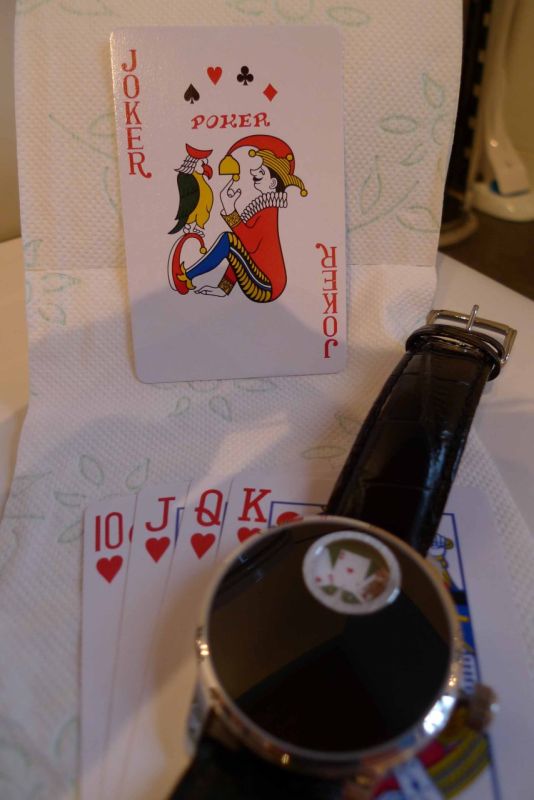 ok, now onto this particular watch who's correct title is the Angular Momentum Axis/XXXI Poker. most of you that know me dont really need to be told why i bought it, but for those that do its because its funky, unusual and 'uncommon'. thats what attracts me, anything fun and functional. it is housed in the 42mm steel 3 piece case. the centre section including the lugs is brushed on the sides and polished on the lug tops, the caseback is screwdown steel with a black plaque to the centre which contains the watches individual number. the crystal has a polished steel bezel around it which sits nicely on top of the centre section. the underside of the crystal is mirror finish black with a porthole at 12. the porthole has a brushed steel edge with a pointer to indicate the time. the time is displayed like a single handed watch, but uses 'hearts' playing cards on a green baise style background to indicate the hours. ace to 10 speaks for itself and 11 and 12 use the jack and queen of hearts. the hour is divided into 15 minute intervals so this is never going to be the most accurate of timepieces, but will always be 'about right'. it comes as standard on a black croc grain leather strap with steel tang buckle. this suits it perfectly. i was sent a steel bracelet seperately as part of the offer, but it seems to have gone missing in the post. i'm sure it will arrive eventually.