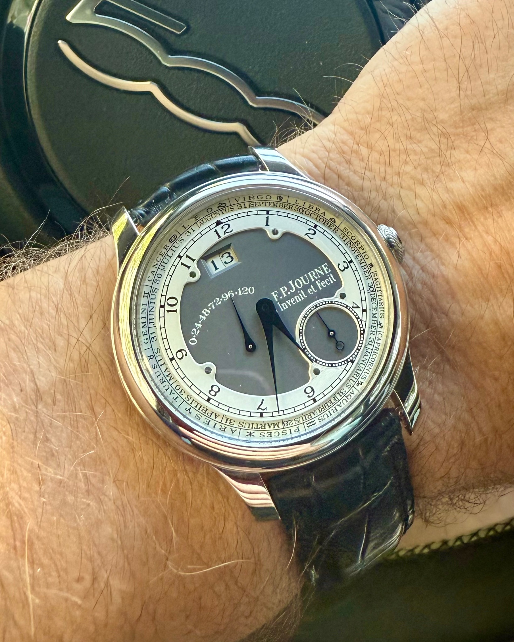 To me this watch is part of my Calendar collection, engaging with more than just the quotidian day-and-date functionality. Obviously it’s a simple complication, but nonetheless it is an intelligent way to display information horologically. Like many of F.P. Journe’s Octa watches, the Zodiaque has both an oversized date display and a power reserve indicator. But its key complication is the ring on the periphery of the dial that indicates both the sign of the zodiac along with the approximate date and month, both of which are read as they scroll past the 12 o’clock indicator at the top of the dial. All the months are written in Latin to match the zodiac naming convention, which somehow makes everything feel more magical.