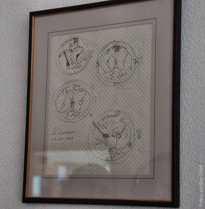 The drawings that started it all. M. Journe scribbled these on a paper tablecloth a long time ago. Can you recognize some of the pieces? I hope one day the one on the bottom right comes to fruition. It's the annual calendar, but this version has a moon on the main dial. Maybe we'll see a perpetual one day?