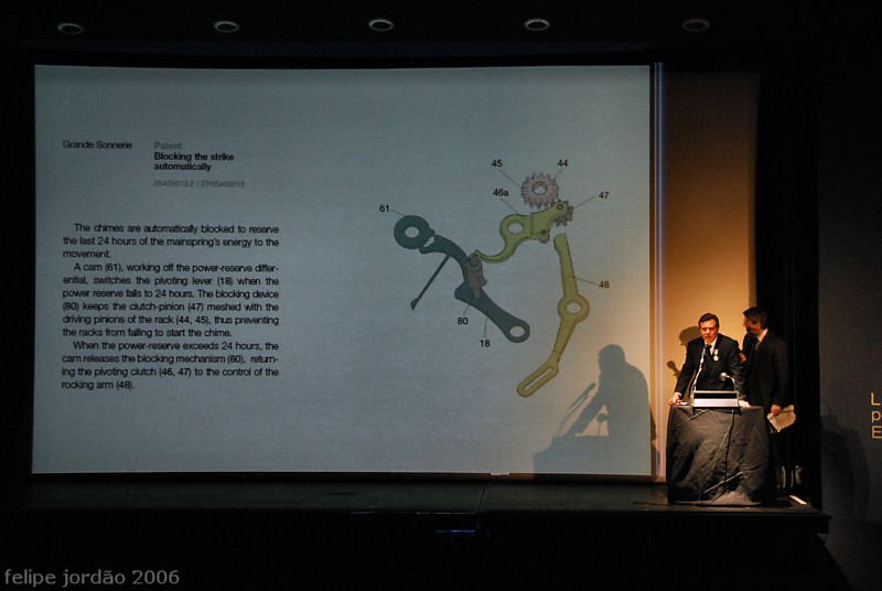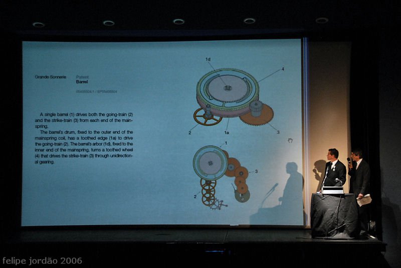 Following the donation, M. Journe began to officially launch his Sonnerie Souveraine in Geneva, following his launch in New York and in Asia at the end of last year. There was a very cool animation of the watch, zooming in and out of a rendering of the working movement, followed by an explanation of each of the ten patents unique to this watch. M. Journe said that production was well underway, with the first piece having been delivered to a Portuguese collector a few weeks ago, and the next piece scheduled to be delivered in the summer. So far things are going well with the watch.