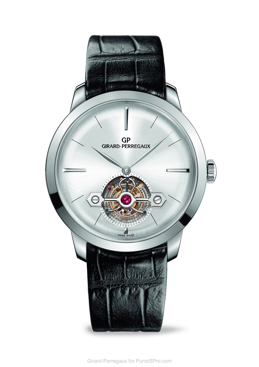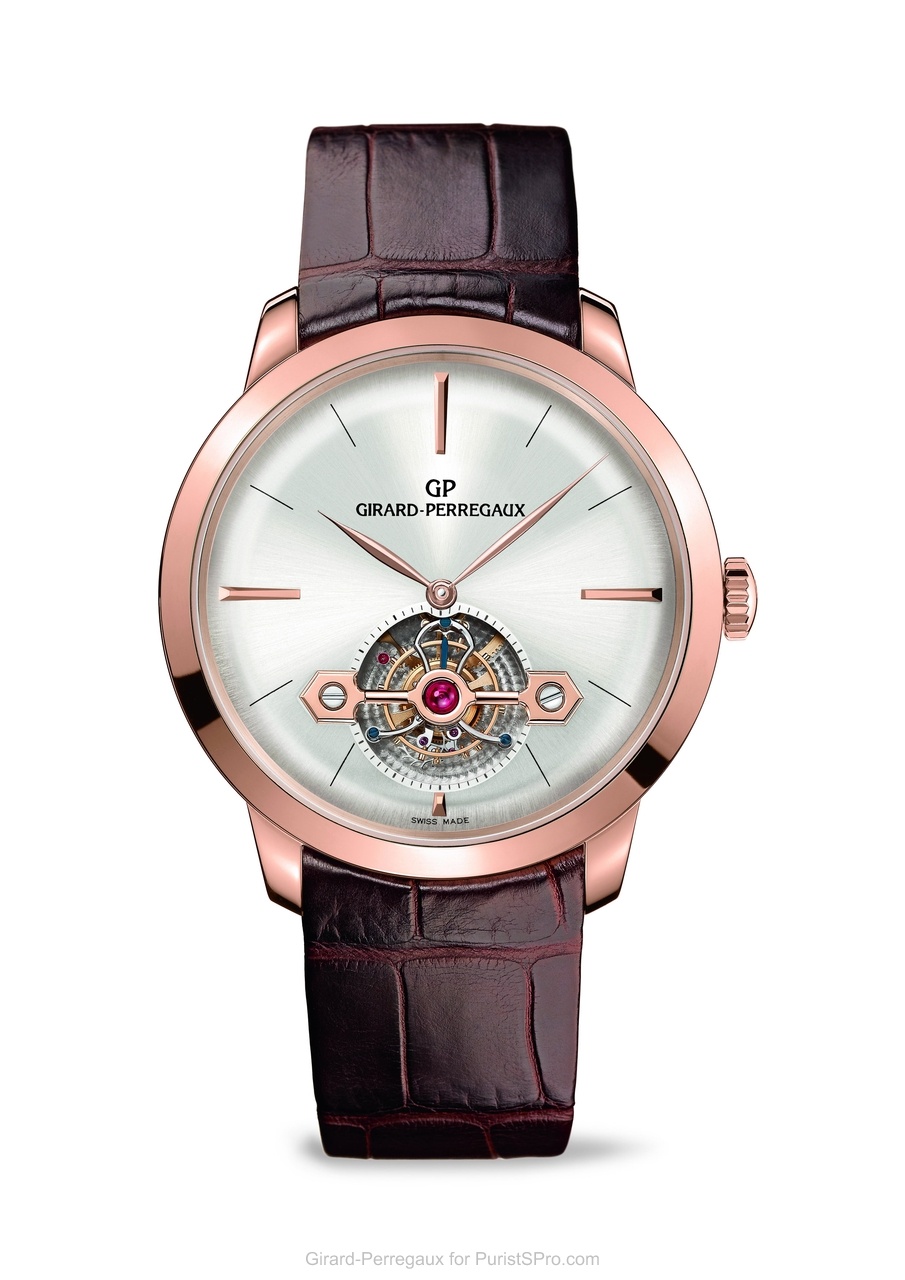 Girard-Perregaux’s new Tourbillon with Gold Bridge is the expression of a unique heritage. The tourbillon mechanism is a combination of the Manufacture’s expertise, tooled with the precision required by the Maison’s GP 09600 selfwinding mechanical movement. This creation is presented in two very limited editions – in both white and pink gold, to underline the piece’s exclusive nature. Its 40 mm diameter houses a silvered dial with sunburst-motif that harks back to the classic watches of the time. Four applied hour markers give aesthetic balance while the leaf-shaped hour and minutes hands fly elegantly over the dial. The tourbillon sits majestically at 6 o’clock.