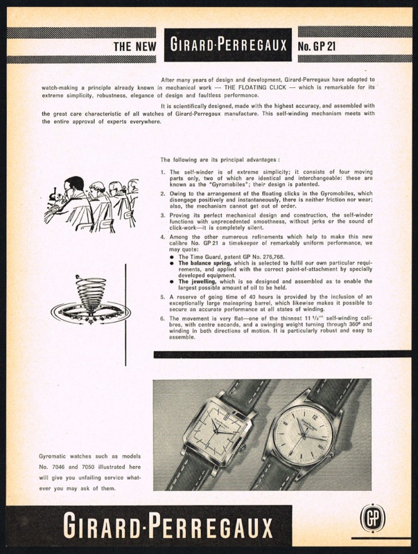 Here is the ad: The text, and your challenge: " GP chose 7 crations to group them in the " Selection " Collection. Ok, they show one of them, the Gyromatic 39 Jewels Ref 7317. Any idea about the 6 others? Doesn't that remind you the Jubil collection fro...