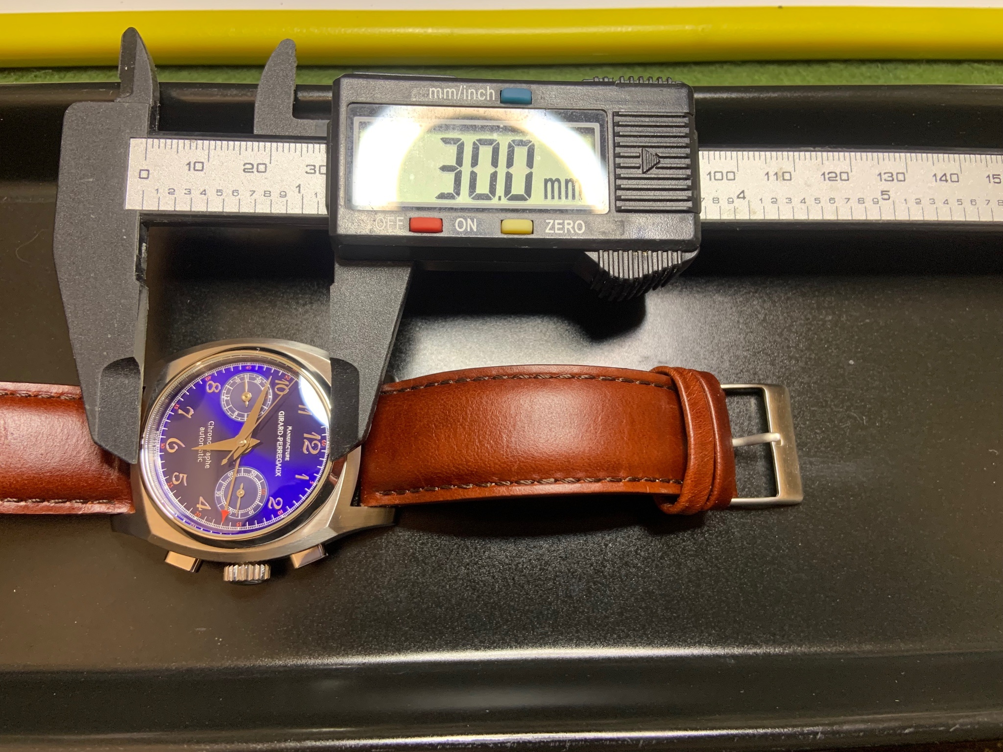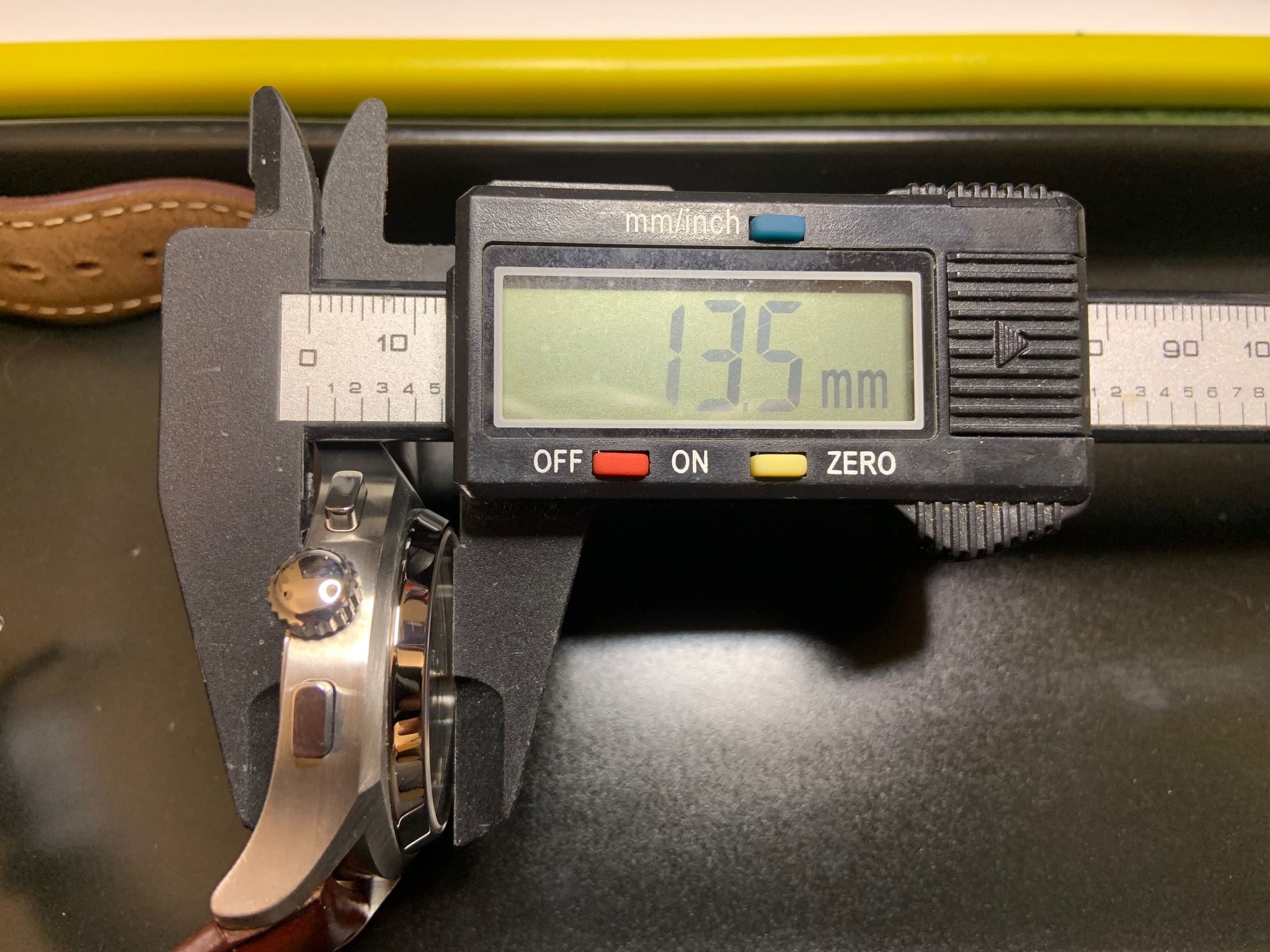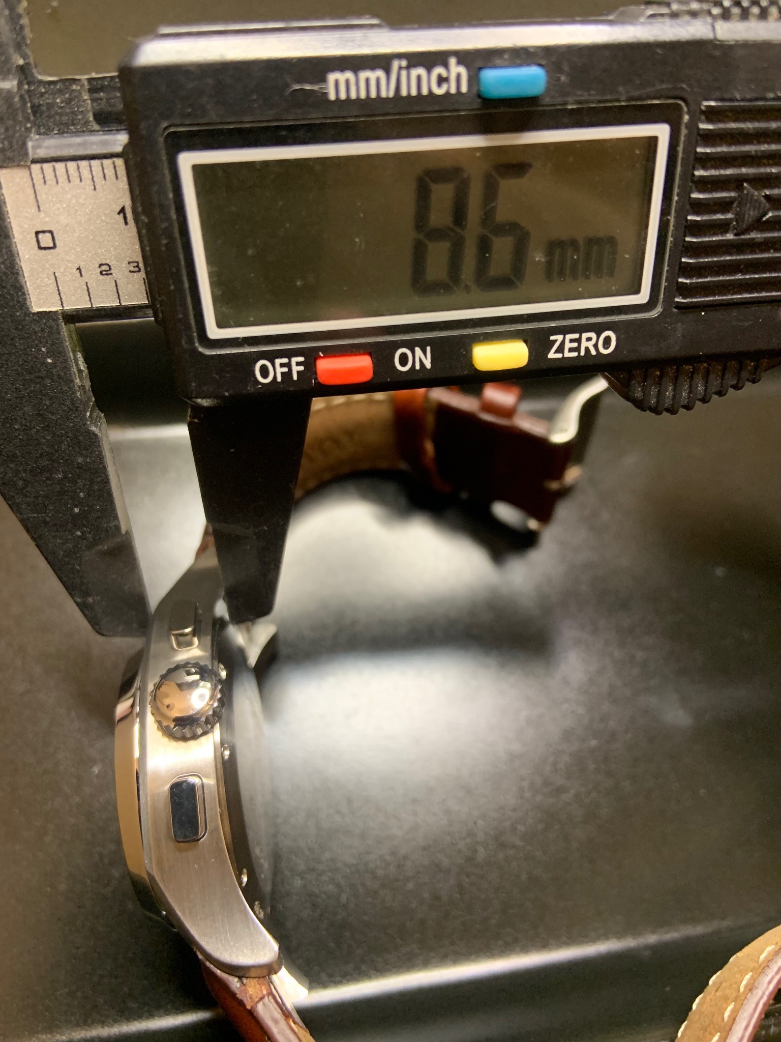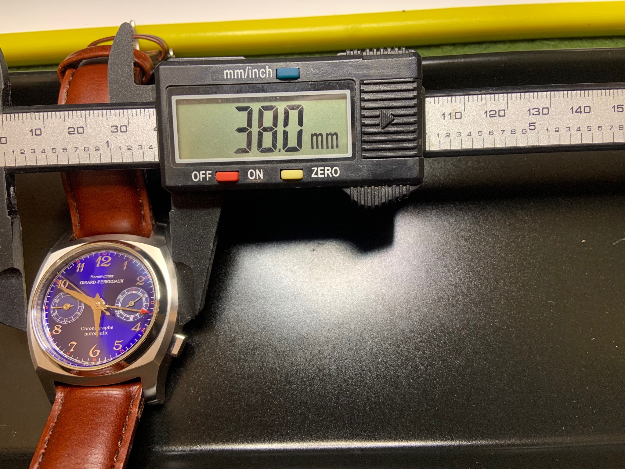 Case diameter: 38 mm Dial size: 30 mm Case size with crown: 41.6 mm Thickness with raised bezel: 13.5 mm Thickness to stepped case: 8.6 mm Lug-to-lug: 49 mm