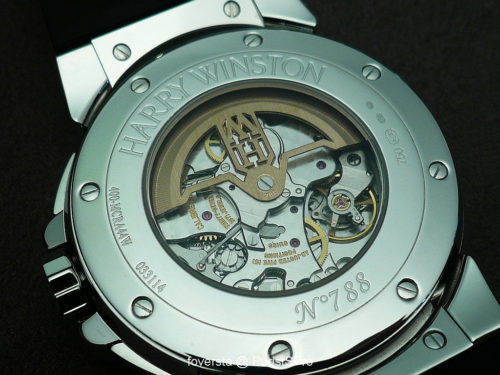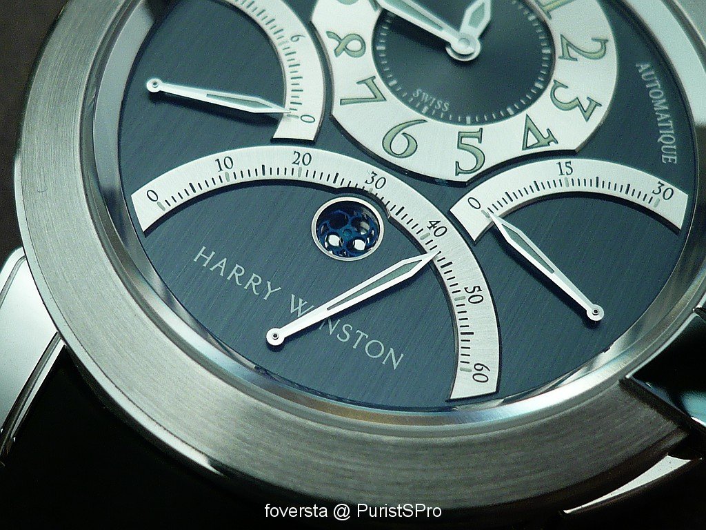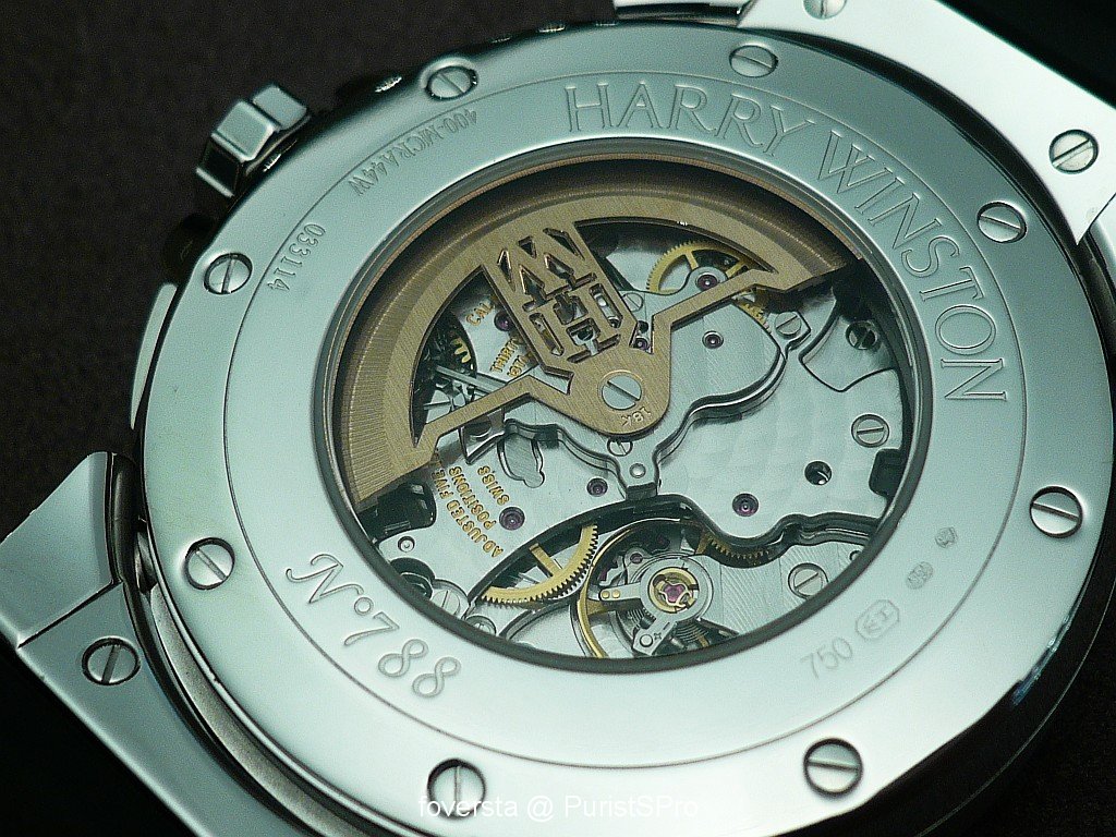 At first glance, we know that it is a Harry Winston watch thanks to its very charasteristic case. Look at the parts on the right side around the crown: again, they have the same shape than the arch of the entrance of the NY Boutique. Thay also bring another plus to the case design: they favour the perfect integration of the pushers in the case. These pushers seem to be very discreet and it is a true pleasure to operate them. Thanks to this integration, the right side of the case is as elegant as the left side.