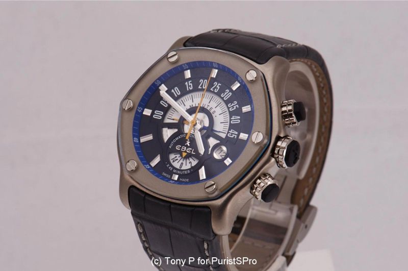 We think of this case as being imbued with the "spirit of the pebble". At Ebel, we believe that nature is the best of all architects. This watch embraces that philosophy - because of its smooth surfaces, it is highly comfortable on the wrist. The chrono pushers are both ultra-modern in shape, and highly ergonomic - their protectors merge organically into the curves of the caseback.