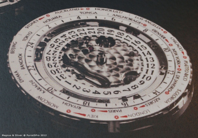 With 46mm in diameter it is a large watch, but with a reason: the elaborate worldtime mechanism is responsible for the dimensions of the watch (note the different diameter of base-movement and mechanism plate on the top image):