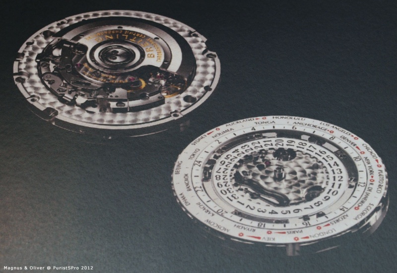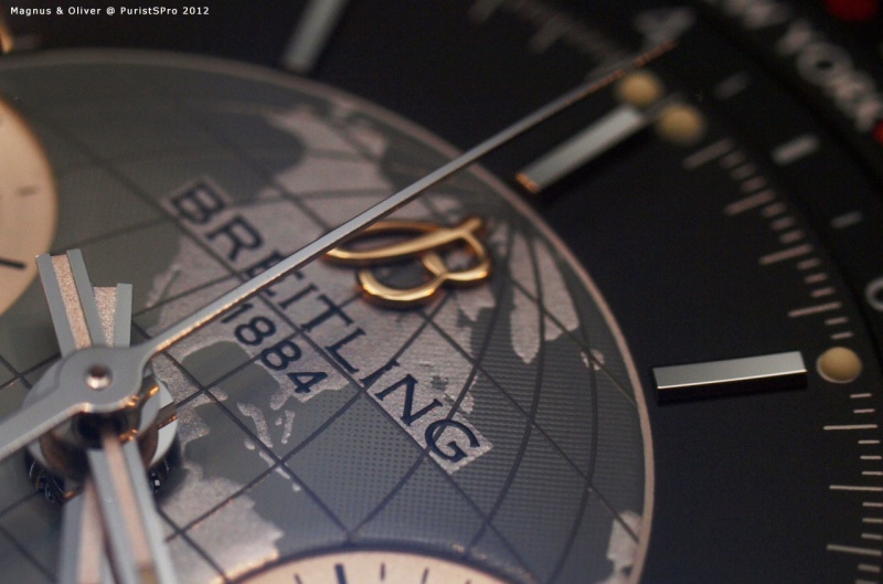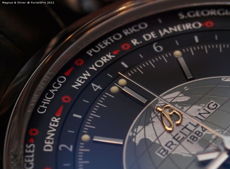 The richness of detail and the quality of execution is as excellent as can be expected from Breitling. Note how sharp the printing is, how precise indices and hands are cut and hoe detailed the globe in the center is executed (depth, surface patterns, colours):