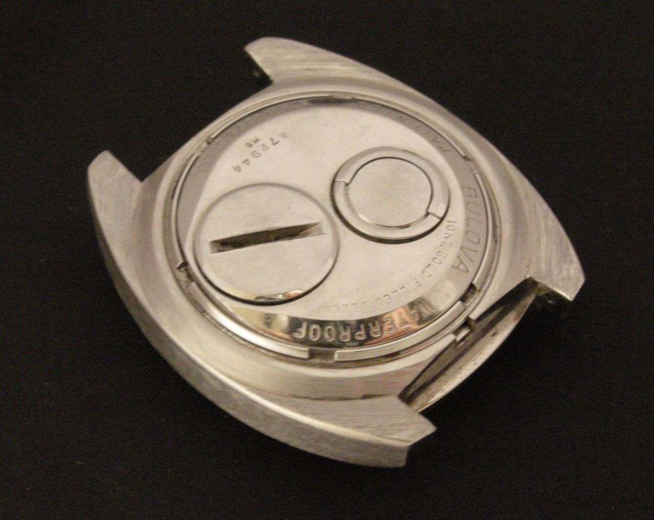 Bulova designed more than 300 case/dial combos, being the cushion shaped the one that pleases me the most. It is also the biggest case with 38mm wide. This cases lack of a conventional crown and this is a pecularity of the first Accutrons. If you turn the watch, you can see a deployant ring to set the time and a screw-in cap for the battery.
