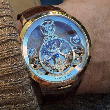 I'm a little distressed by the more recent iterations of this watch - they strike me as somehow gaudy, what with the profusion of materials and finishes on the "dials". I think some simplicity works better with a display of this much inherent visual complexity. (I also miss the serpentine blued steel power reserve pointers.)