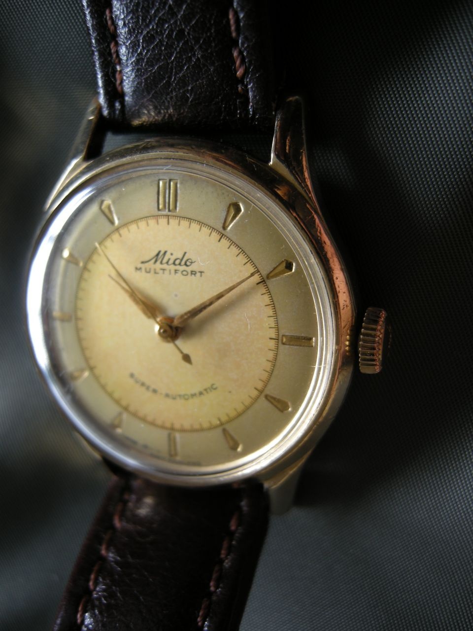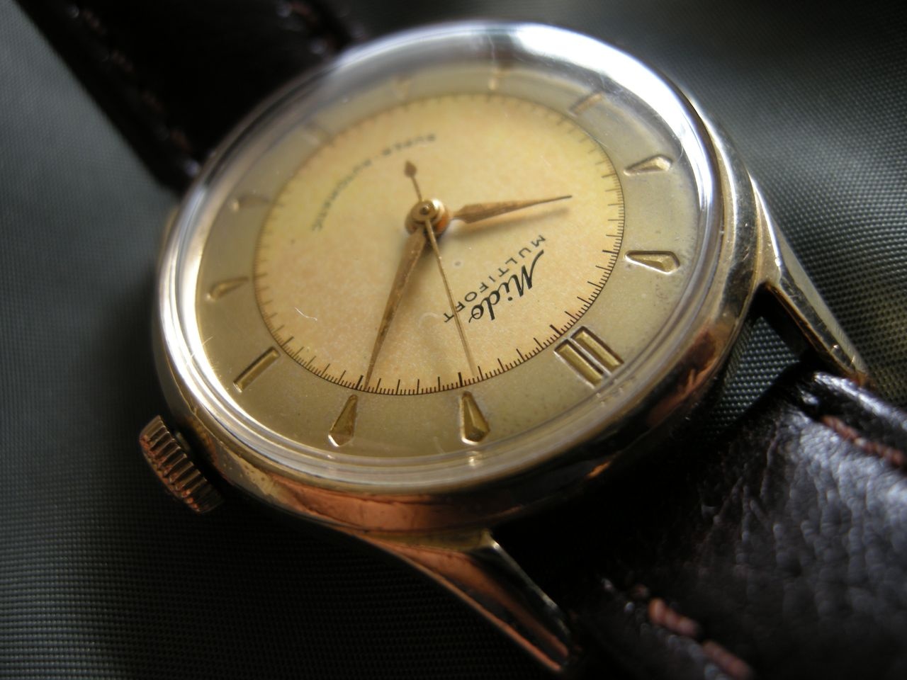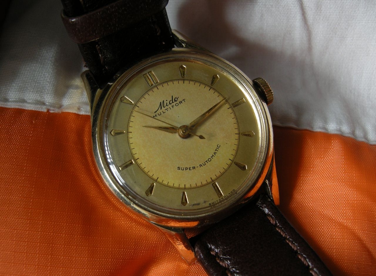 Mido Multifort Automatic Bumper Sweep seconds Calibre 0917, 17 jewels, the only large-scale produced regulator featuring a free oscillating hairspring. The end of the spring is fixed between two rollers, adjusting actually its length. No isochronism error by the gap between the regulator pins. Nice feature, eh? Serial number 1349656 gold cap case, with a little wear at the end of the lugs and a lot of bumps and scratches, otherwise, a nice vintage watch. I have to do more research to find out what year it was made. Acording to some expert at other forum it is between 1949 and 1953.