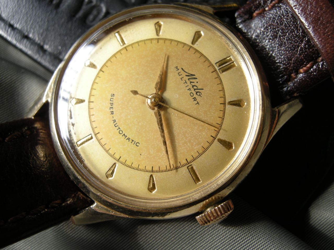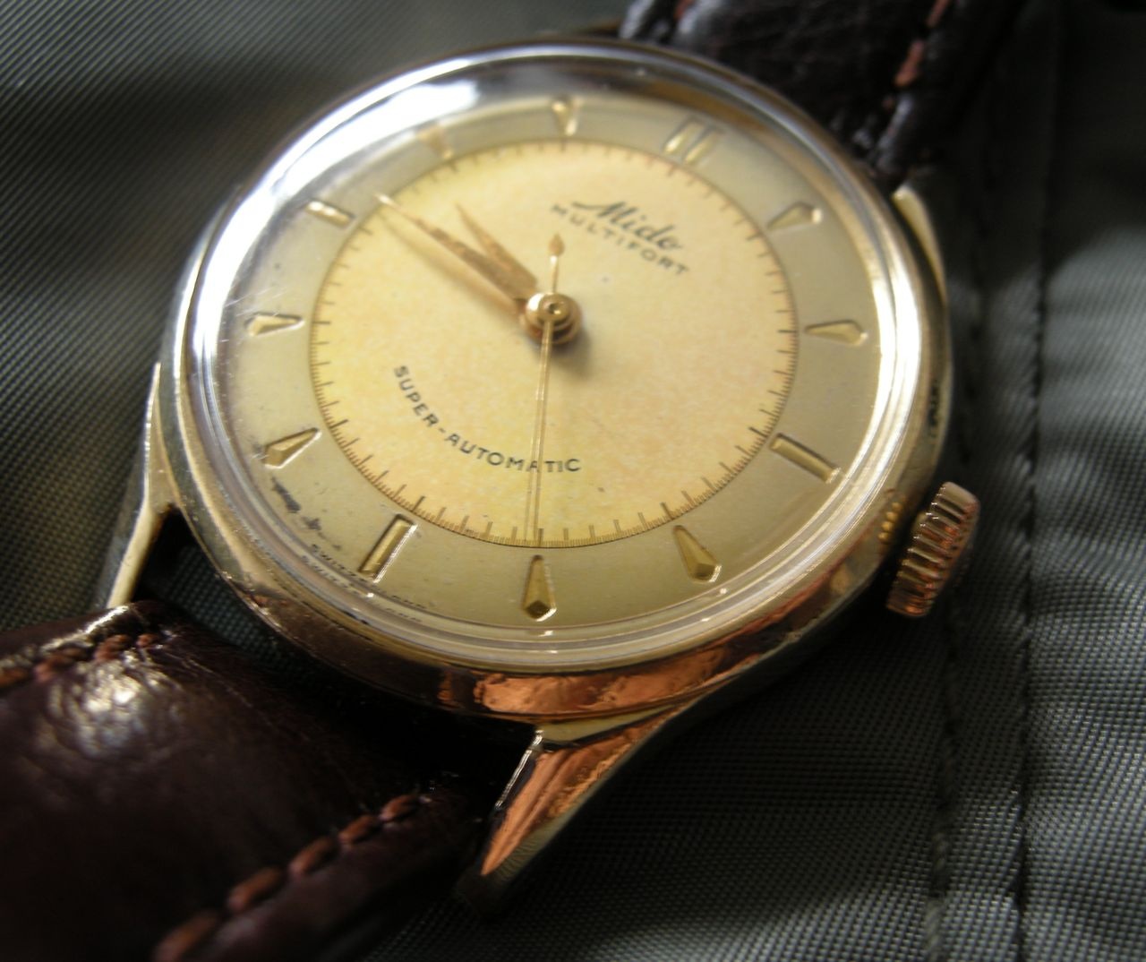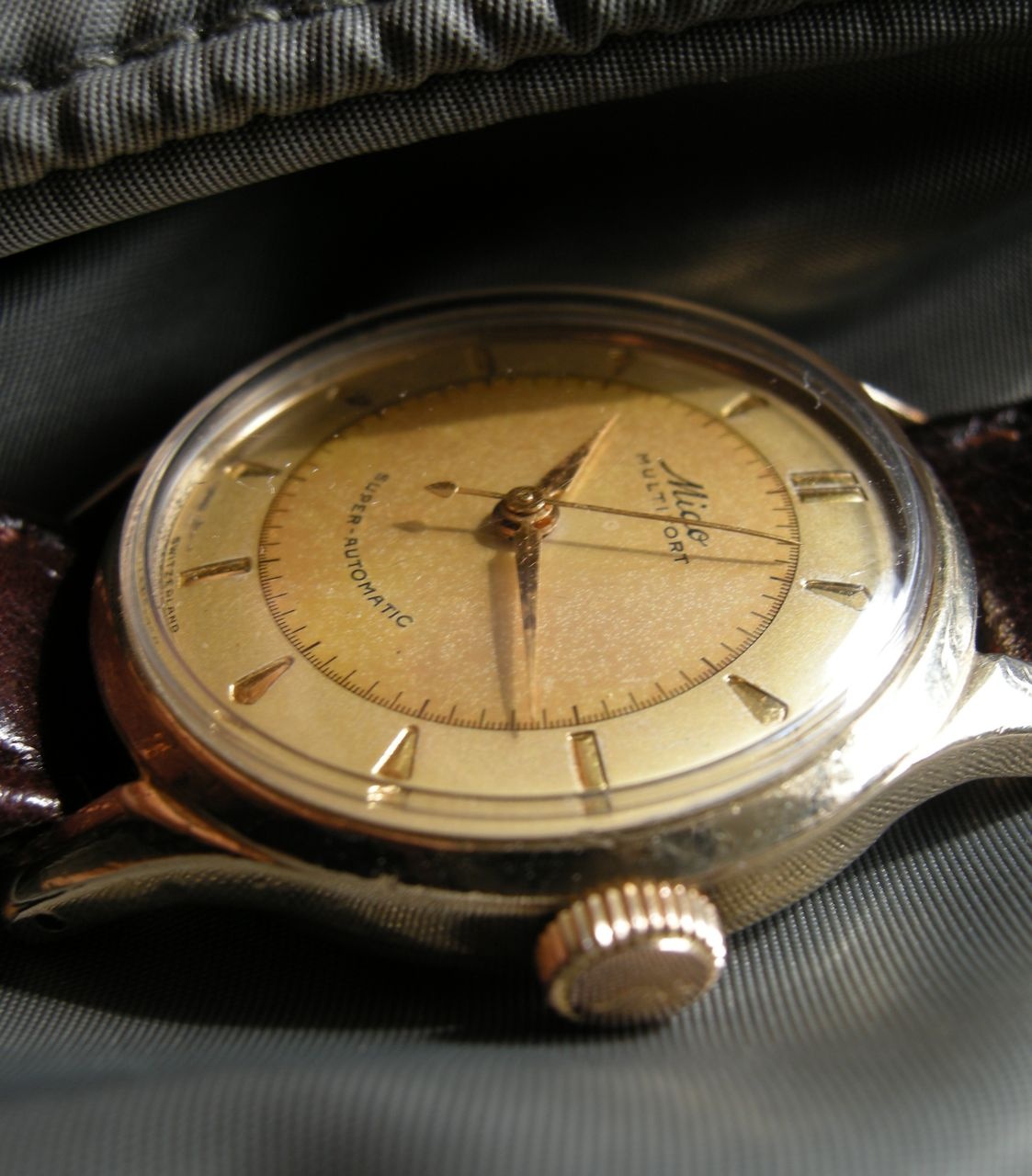 Mido Multifort Automatic Bumper Sweep seconds Calibre 0917, 17 jewels, the only large-scale produced regulator featuring a free oscillating hairspring. The end of the spring is fixed between two rollers, adjusting actually its length. No isochronism error by the gap between the regulator pins. Nice feature, eh? Serial number 1349656 gold cap case, with a little wear at the end of the lugs and a lot of bumps and scratches, otherwise, a nice vintage watch. I have to do more research to find out what year it was made. Acording to some expert at other forum it is between 1949 and 1953.