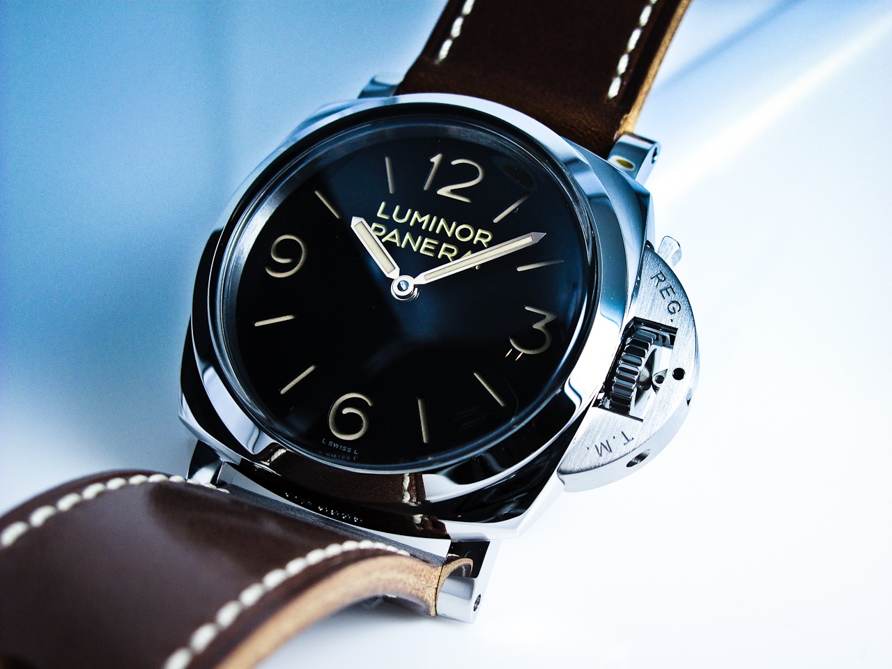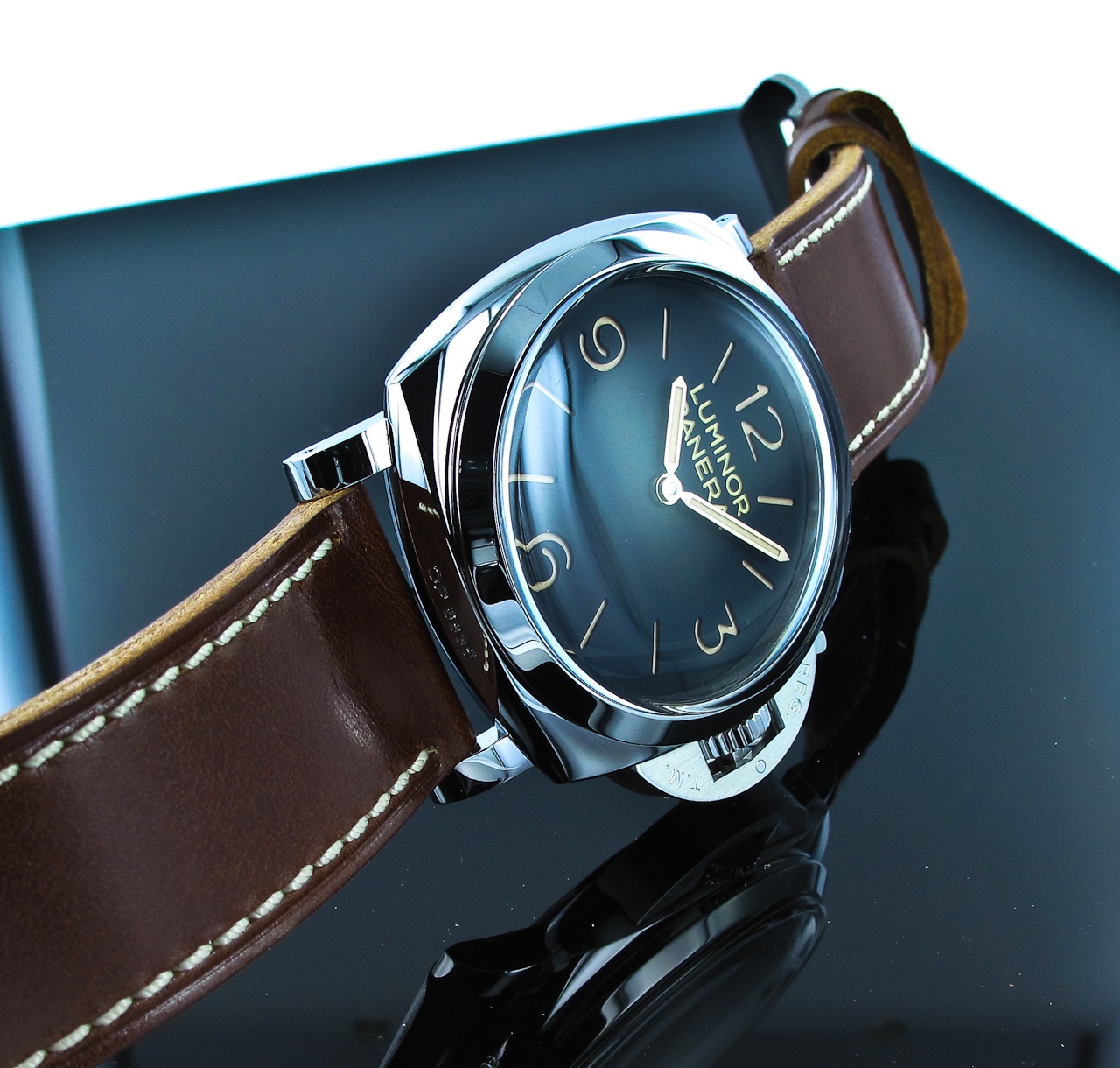 The matt black sandwich-style dial offers a solid background to feature the gold hour and minute hands. The same Arabic numerals with an aged patina that glows strong. Large font Luminor Panerai is thick and contrasts slightly with the index markers give it more presence.