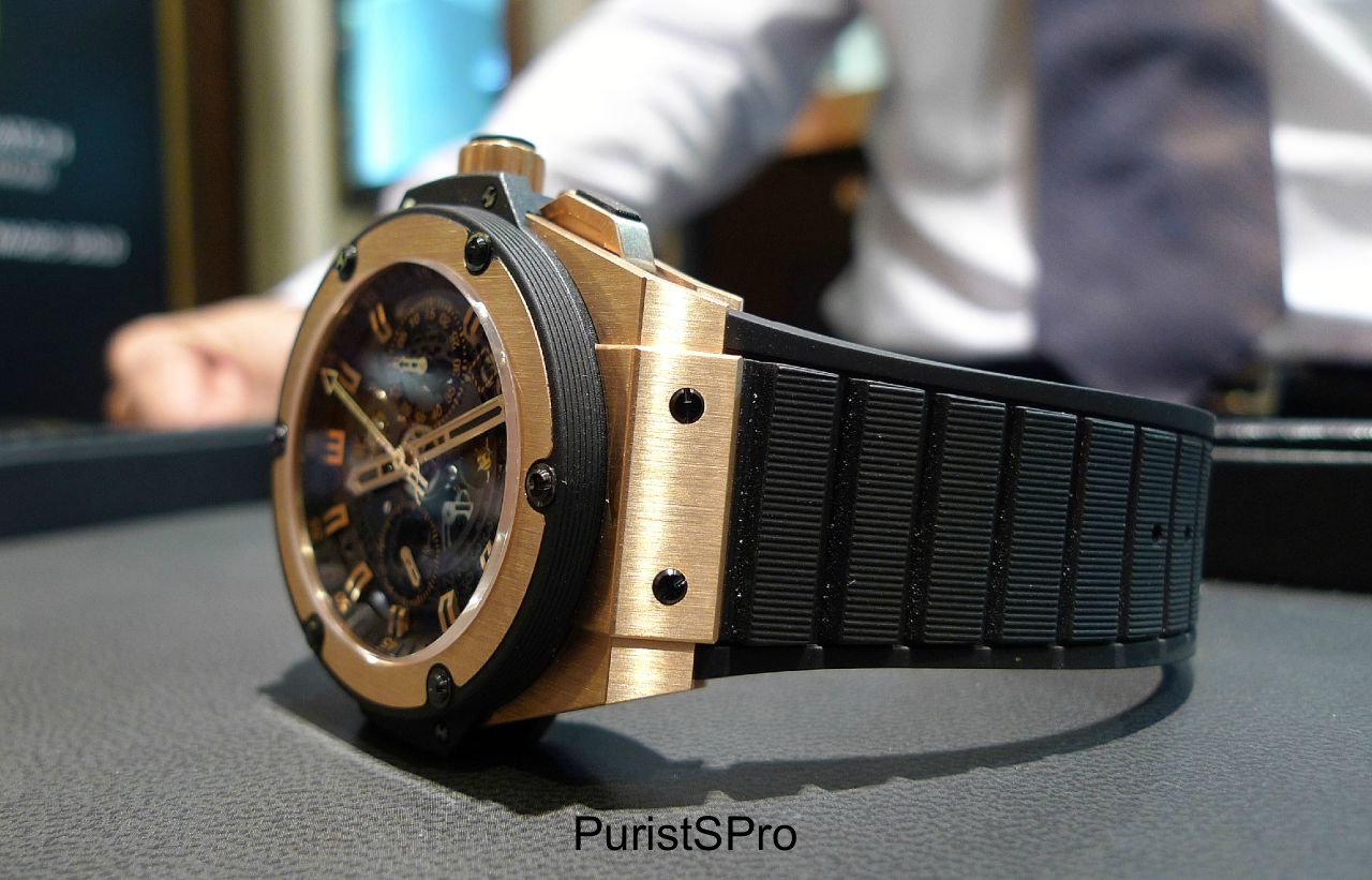 Hublot manage to make the watch legible because of the gold hands and accents. The date is not that easy to read, but the information is there when you need it. The column wheel for the flyback chronograph is visible at the 6 o’clock position, so you can enjoy playing with the chunky rubber-capped pushers. The 60-minute elapsed chronograph counter at 3 o’clock is a useful indicator on a chronograph.