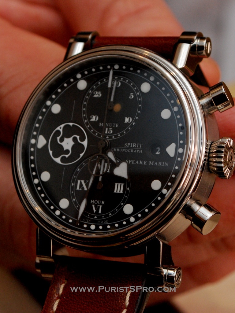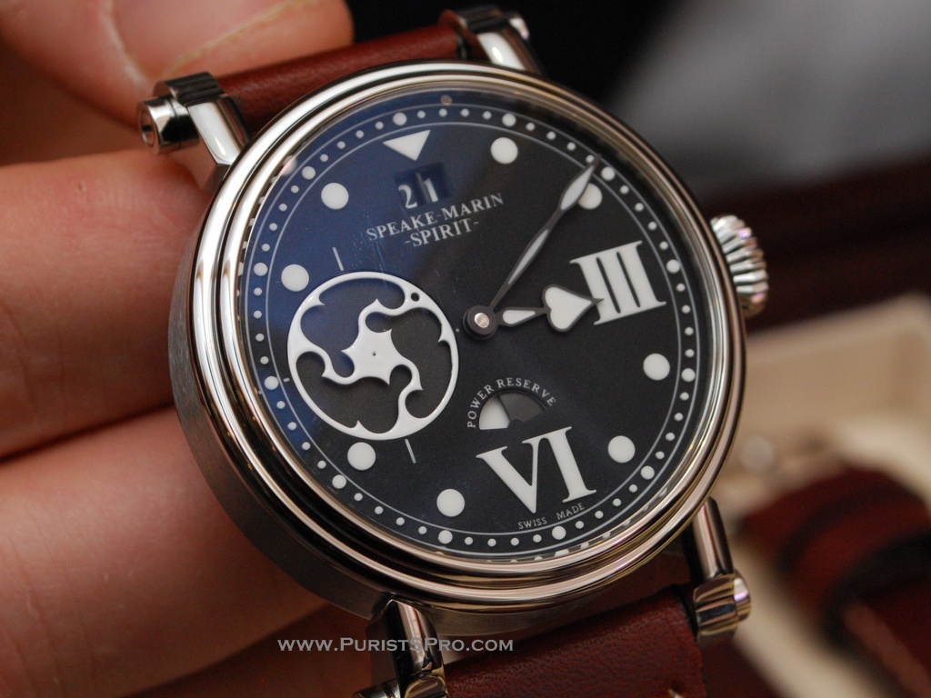 The Spirit Wing Commander "3-hand" watch with power reserve and a (very small) big date display.  We note the very large wheel in the form of a topping tool which does duty as the seconds hand.  This topping tool form has always been the Speake-Marin signature rotor form and has now found its way onto many dials.