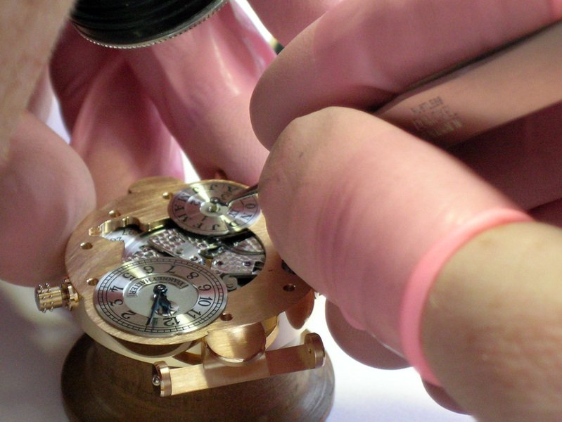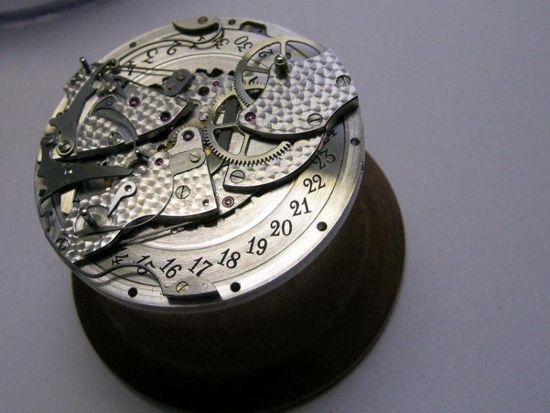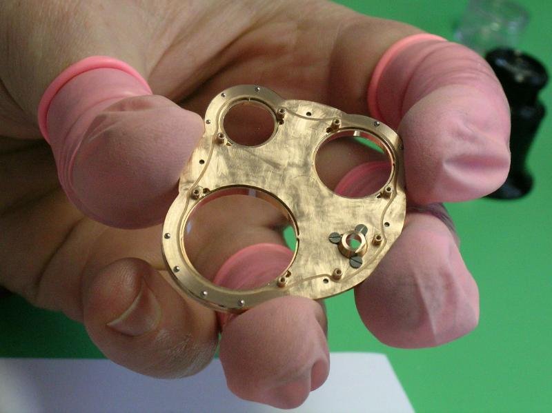 The movement just assembled, here is already one month of work just in pre-assembly and assembly. The movement basis is a Lemania. Ho, I hear some saying in the back that this is not in-house. Well, you're right, but you need to understand that the watch was first built in 1998 and at that time, Vianney wasn't feeling confortable in making a whole movement. He did learn it later with the Goldpfeil experience. The Trio is in-house movement and he's planning to make his own Antiqua's mainplate soon, when the second CN machine will be operational. For the time being, the Lemania is still used but I can tell you that the changes made are making it something really different from its basis (new stones, new openings for the fucntion, moving some wheels, ... In the end, the in-house will be easier to produce, and that's why they'll be doing). Note also the architecture of the overall result that is far from the usual modular QP. The reason is that they worked a lot in trying to integrate as much as possible of the complication, in the basis. The idea was to keep the movement as flat as possible. You can notice as well the finishing of the parts, such as the bridges, wheels, springs...