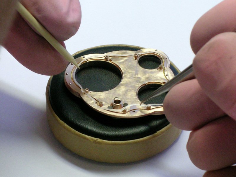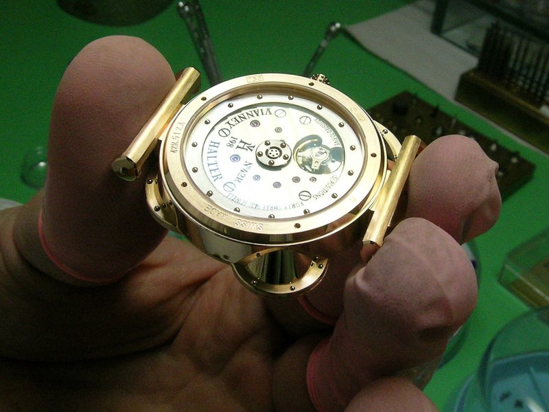 Pay attention at the perfect polishing of the case. Sharp angles, alternance of soft and shiny... It might take about a week to polish a platinium case to reach this level of perfection. Vianney is very proud of the finising of its cases. Of course, the buyer will damage it at the first contact but his feeling when he'll open the box worth the time and efforts spent in a high level polishing. I Didn't see Laurence polishing a case, that's one of the rare operations I missed but there is no lathe polishing here that would damage the angles. Only sticks, various abrasives, and patience, a lot of patience...