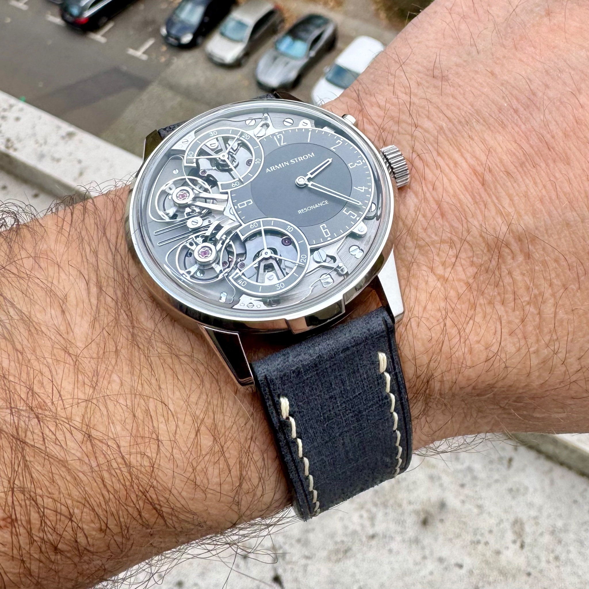 ...but I am on my third strap, with a fourth about to arrive. Mine came with that same blue strap, but I didn't like it so much. Nonetheless Armin Strom has a strong strap game, which I realised when I saw the line-up of models at Geneva Watch days. I met Serge and Claude (gratuitous name-drop) there, and they suggested another one of their straps... which wasn't perfect, but not bad. Dark blue with turquoise stitching. The best part was the matching pair of socks it came with. They do a lot with Delugs, so I ordered a plain gray one, which I like a lot. It's currently on the watch, and nicely focuses the eye on my grey-on-grey dial. Now I am awaiting the arrival of a custom made Ostrich Leg leather one, but I am concerned it may be too busy. I should have it by Tuesday, I can post more pics then.