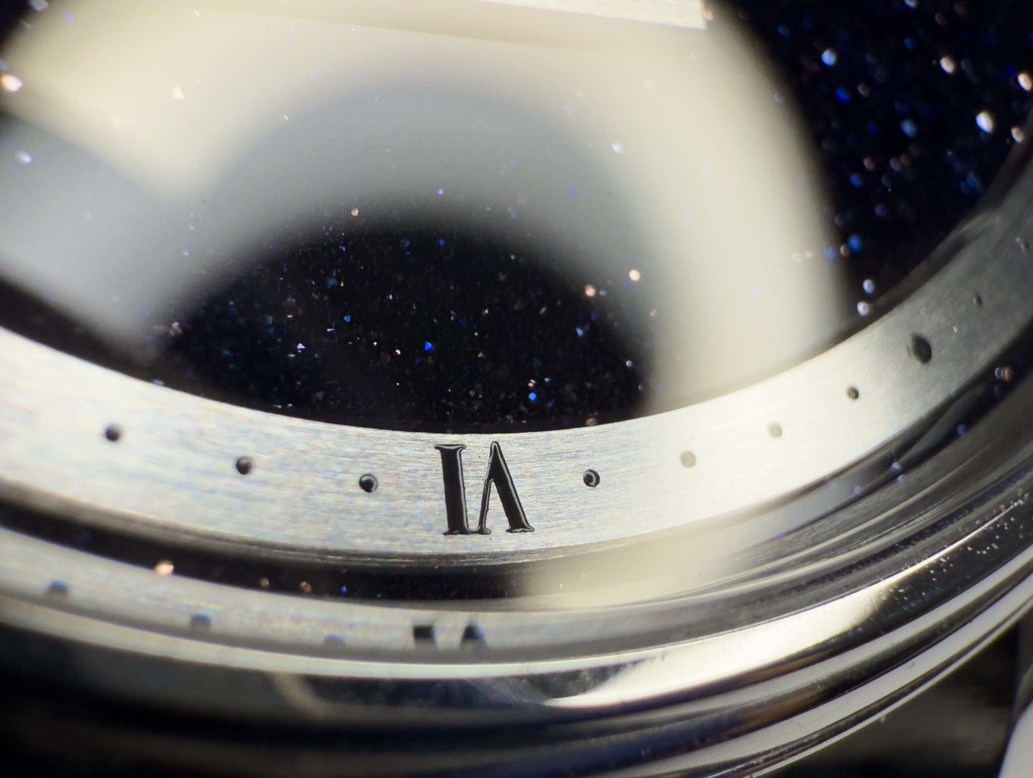 -Both the name plate on the dial side and the chapter ring have anglage on them. The name plate is also grained.