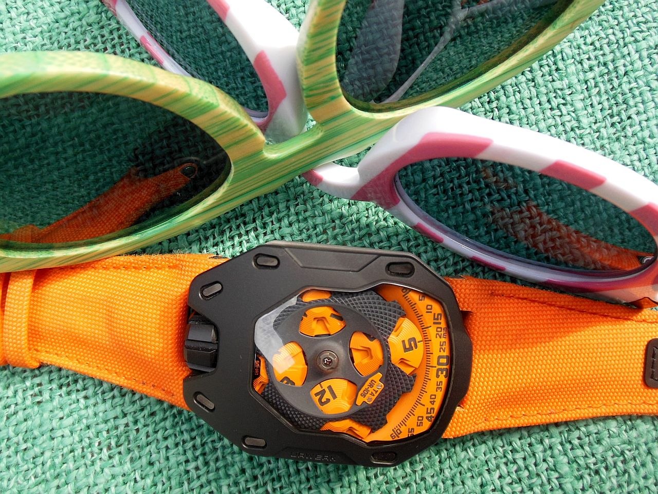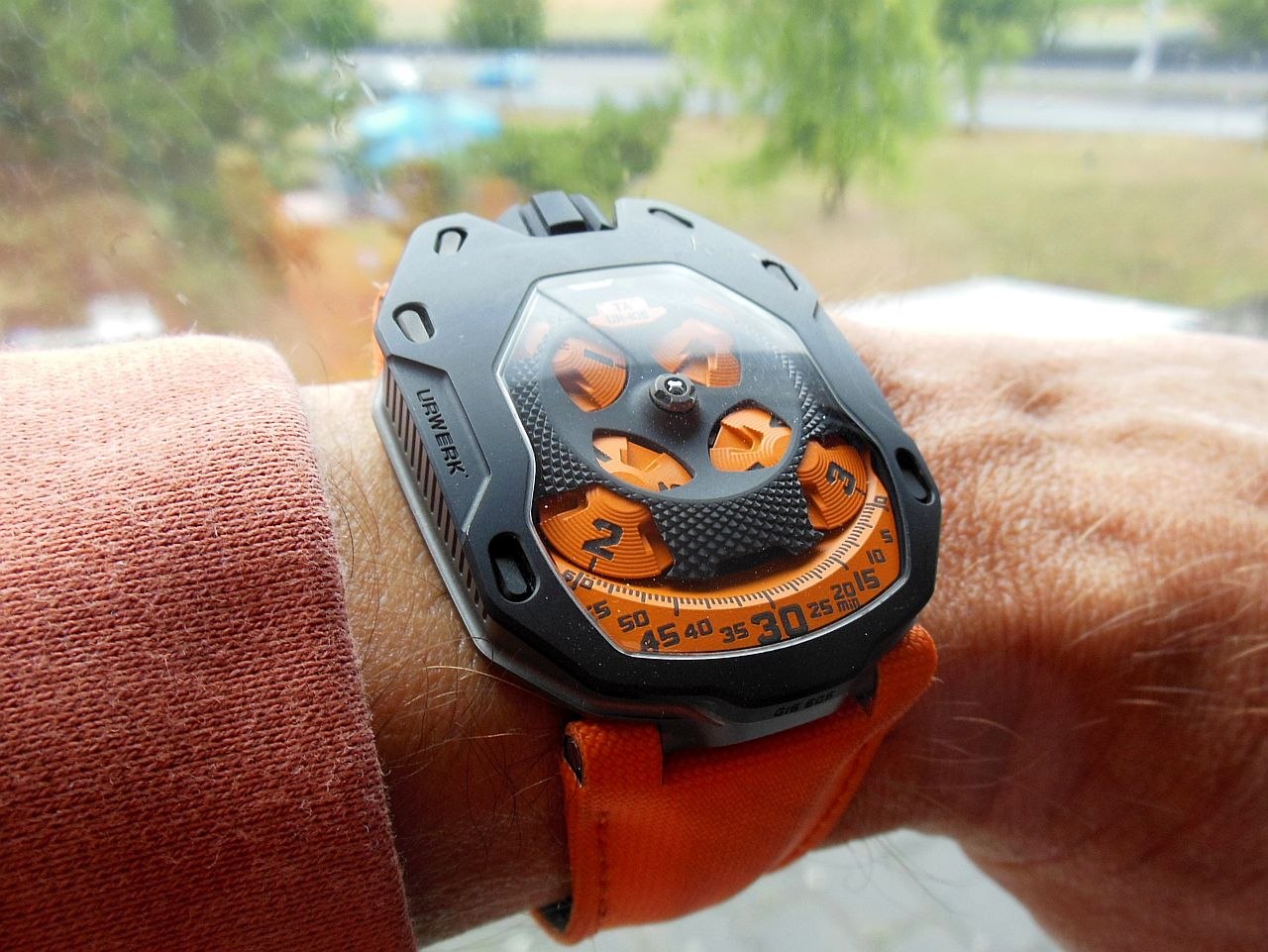 Switzerland where I live is pretty watch conscious, but still, I have never been asked about a watch I was wearing as much as this Urwerk. The watch attracts attention as much by its shape as by its color. Eye-catching is the word. The typical Urwerk shape is very different from what one usually sees and even here in Switzerland Urwerk is flying under the radar.