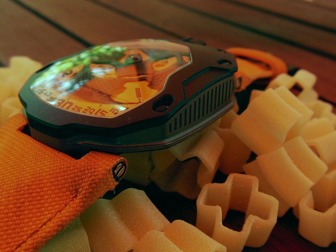 This bright orange band is an enigma for me. The material is a hard woven plastic while the inner lining is leather. When handling the watch the band seems to be hard and awkward. Strapped on the arm, however, it is one of the most comfortable I have worn. Even in the very hot weather we have had recently, with sweating under the band, no problems. Initially there was some fraying at the edges of the relatively hard woven material, but after a couple of days this did not advance any more.
