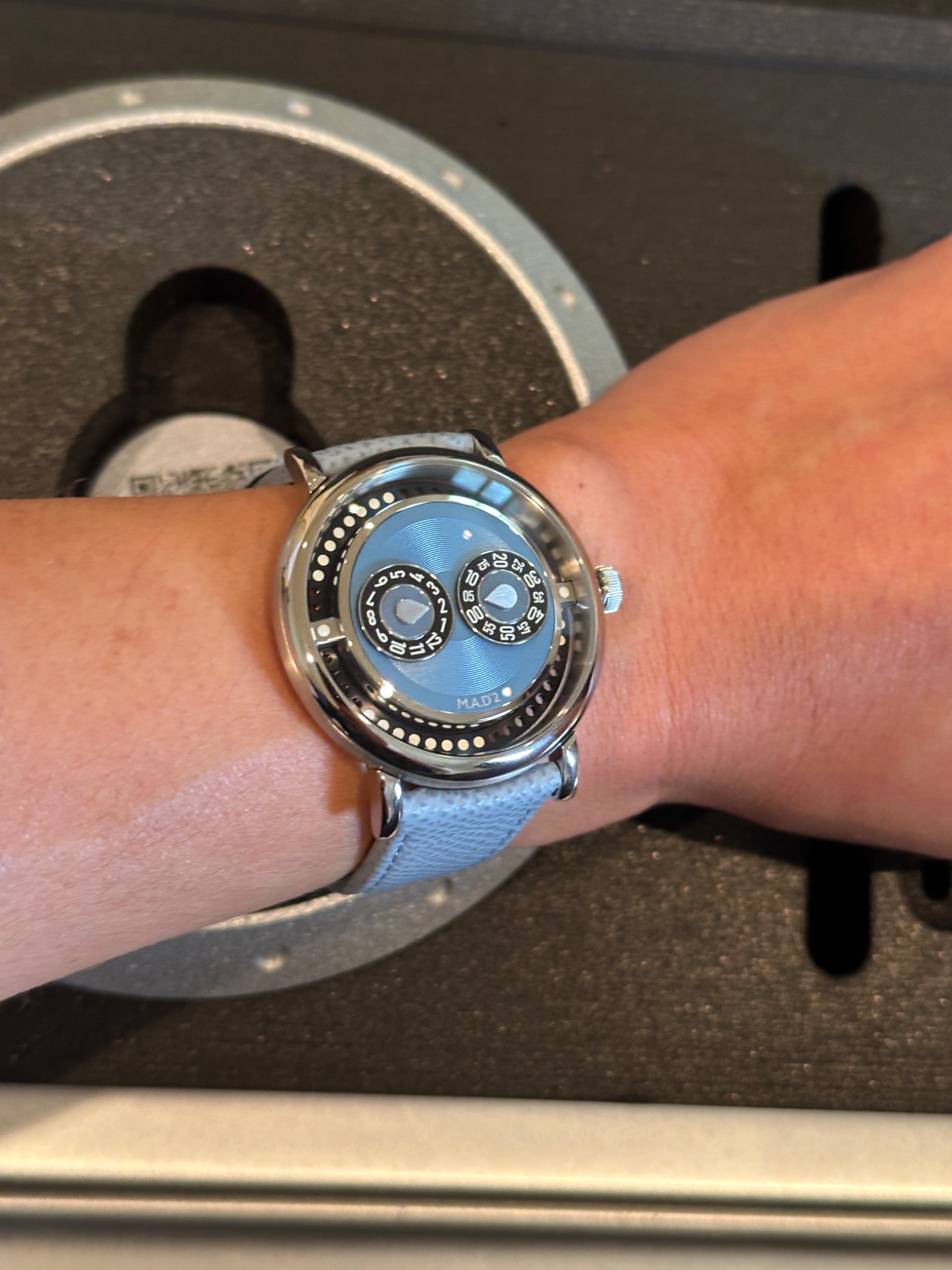 Whoa, this watch looks good on the wrist! It even has a nice slim and elegant profile. The case sides are both brushed and polished (like Lange)! Nice details! Also, what a nice light blue color! It's a fun color, great for warm weather attire!