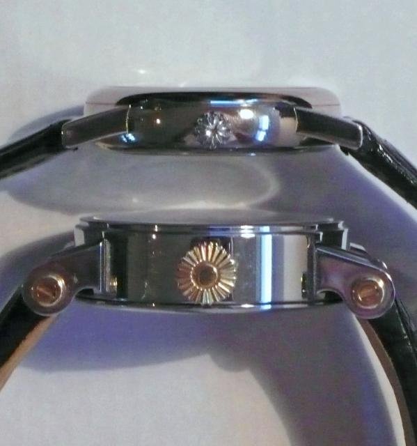 The side-on shots are quite telling, aren't they? You mustn't underestimate the 'presence' [read: 'bulk'] of the Shimoda! Don't get the wrong impression: that is a large part of its appeal. In a similar vein, those lugs stretch out to the sides of the wrist. Quite a signature feature. The lugs on the Jutzi, by comparison, are shorter, lower but equally as 'square': they sit comfortably within the average wrist. Note how they carve a straight line through either side of the round case; a circle superimposed over a rectangle. Complementary tension. (This prose grows worthy of a J*D website!!).