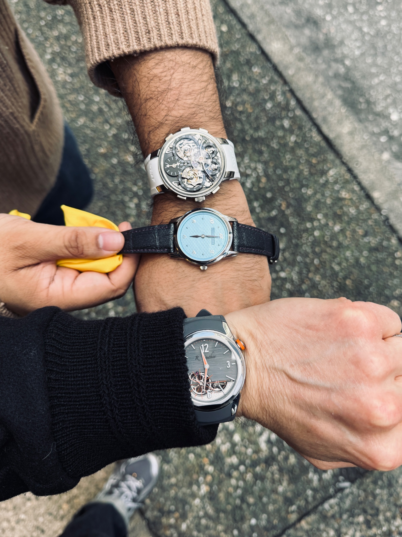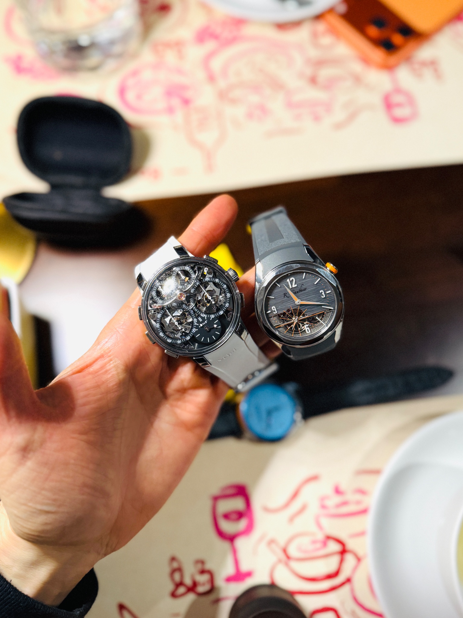 I’m traveling with my Romain Gauthier C6 and M2 has his current muse (the MB&F LM Sequential Evo) but a local upstart which we’ve seen here several times.