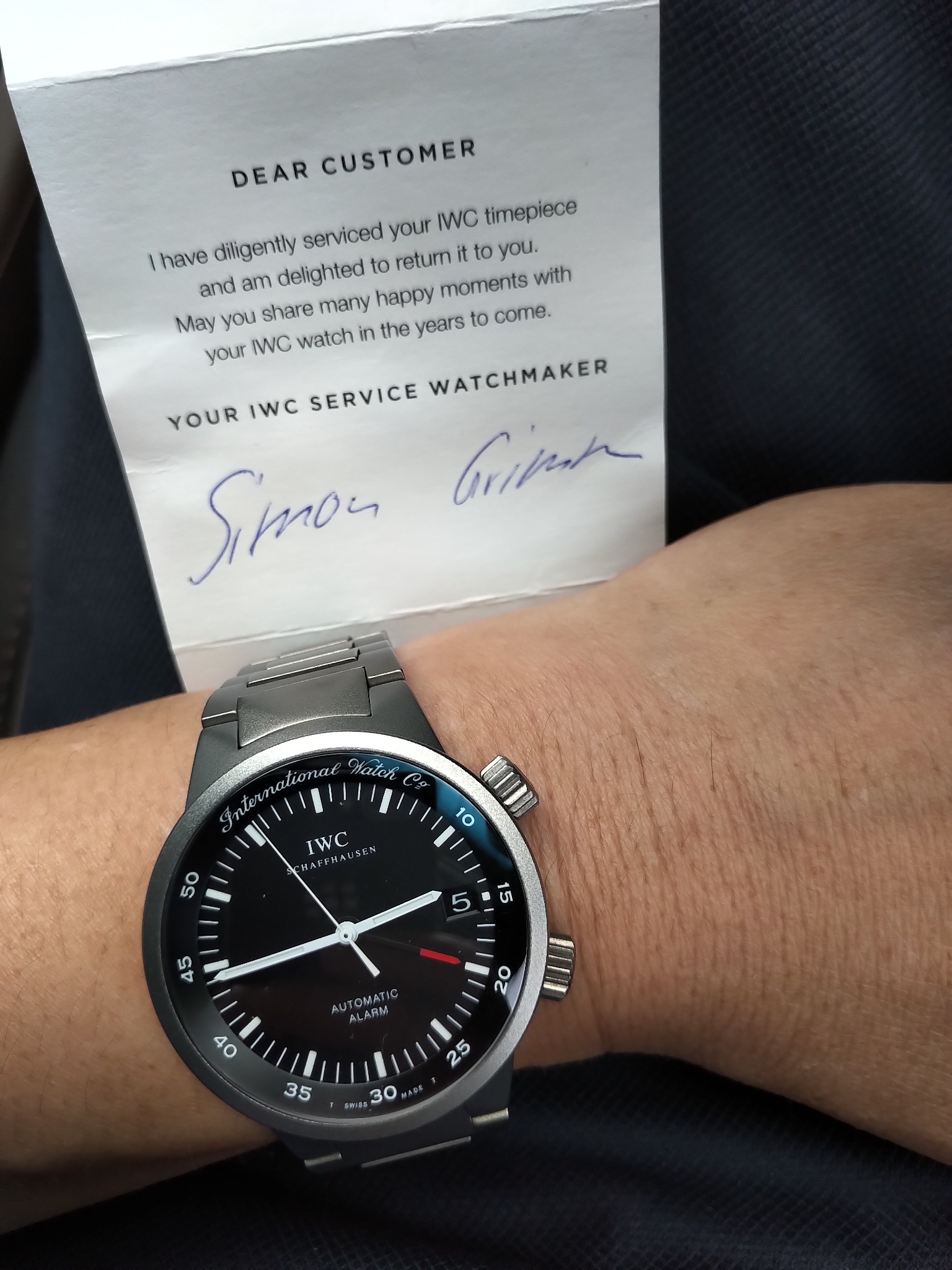 Integrated bracelet with fully adjustable links. Sandblasted titanium grade 2. Alarm function with blackened hand to make the red tip "floating". Black date windows for uninterrupted symmetry. Crisp, ultra legible hands and markers. Oversized crowns with sharp knurling for easy manipulation. Very unusual 50 meter WR with screwed down crown.