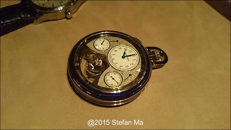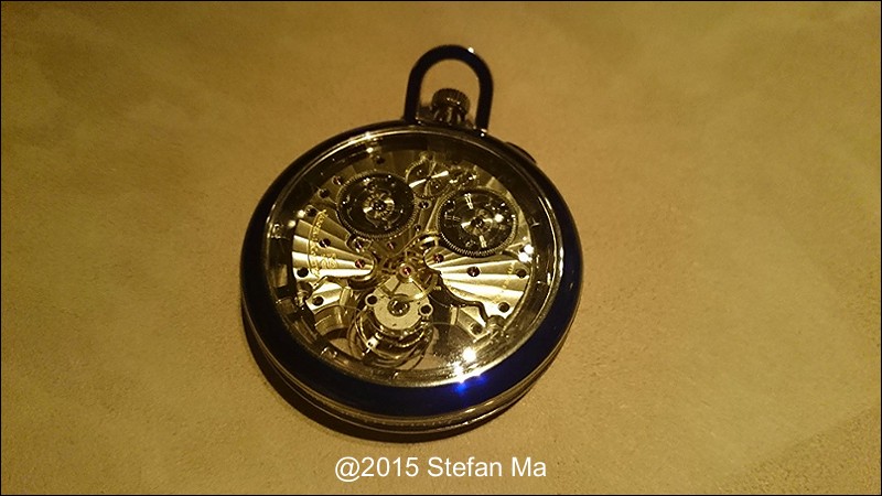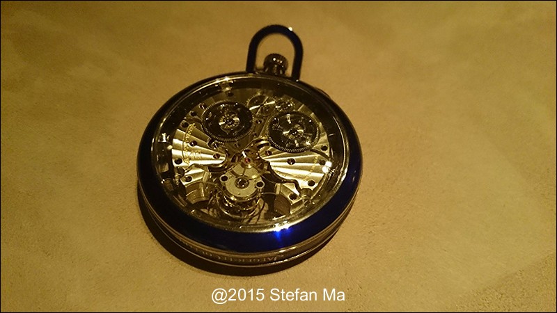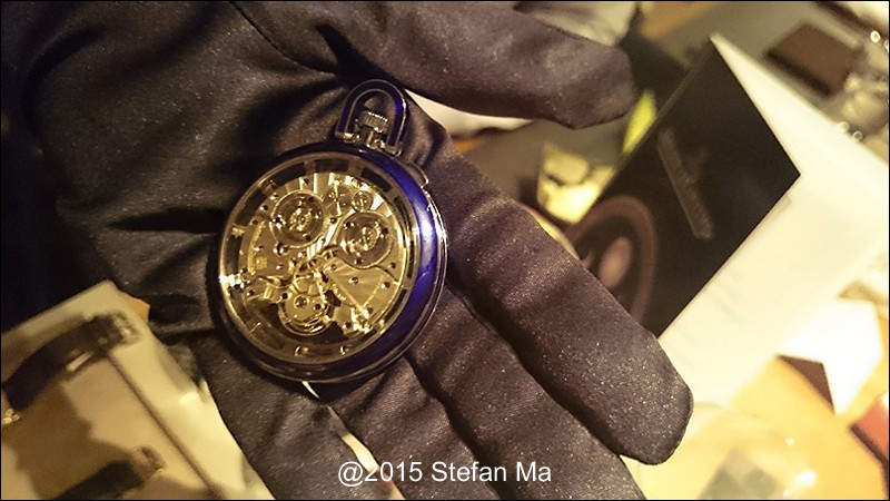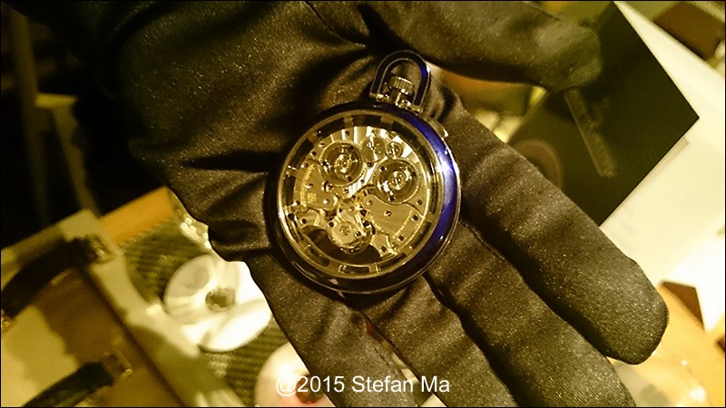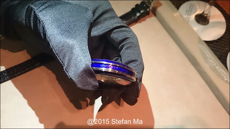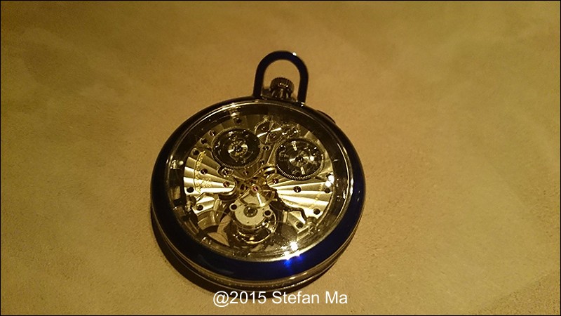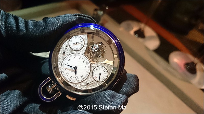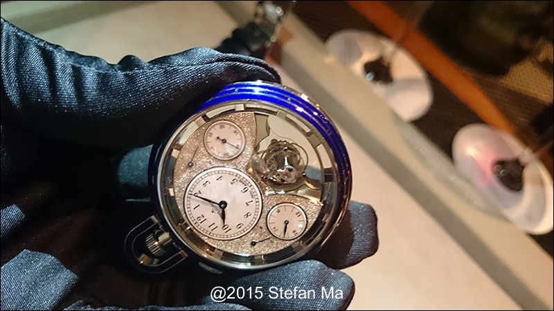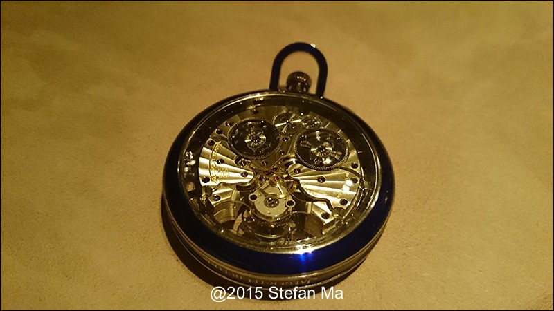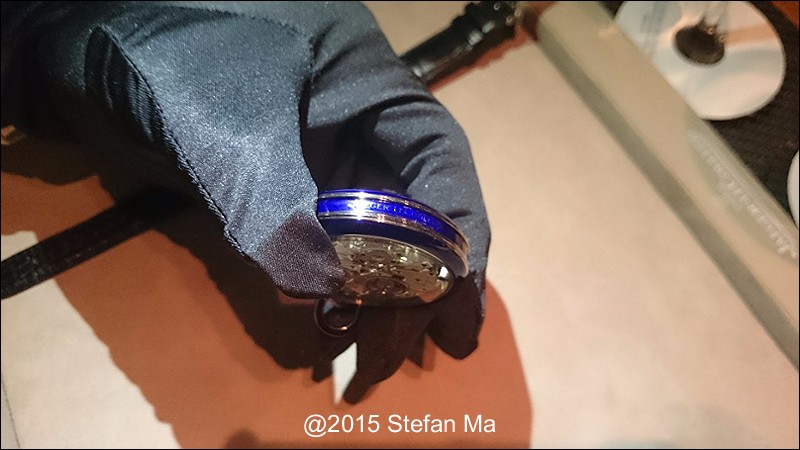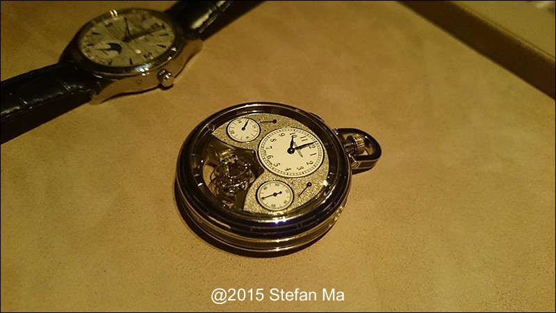 if you have been following what novelties made by MJLC in each SIHH, you would definitely remember in SIHH 2014, MJLC had launched a pocket watch which housed with Duometre Spherotourbillon in a silver dial and grand feu enamel sundials. as told, it is in white gold and in 47mm in diameter. if you look at the subdial at 9 position, it shows the 24 hours which means to use GMT in different timezone. besides, there are two little hands to indicate the power reserve at 10 and 2 positions which supplies separate power for the time clock and also for tourbillon itself respectively. only three pieces of this grand creation were made. as also told, the first two pieces have been sold, and now only one last piece left and still is available. this last piece is currently on world tour and just arrived to Singapore Orchard ION Boutique yesterday. was honored to have a chance to view it and even hold it on my hand which gave me stunning and wonderful feeling that cannot use words to describe it. without further ado, I have taken some pics of this amazing masterpiece using my mobile phone to share with you guys here, but the quality of the pics is not that great, but still it does show the sublime face of this pocket watch. hope you will like and even love it as much as I do!