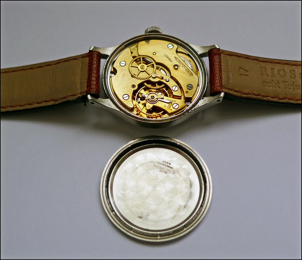The inside part of the case back is common with the SHOM one, signed LeCoultre and bearing the mentions " acier inxydable / Swiss ".