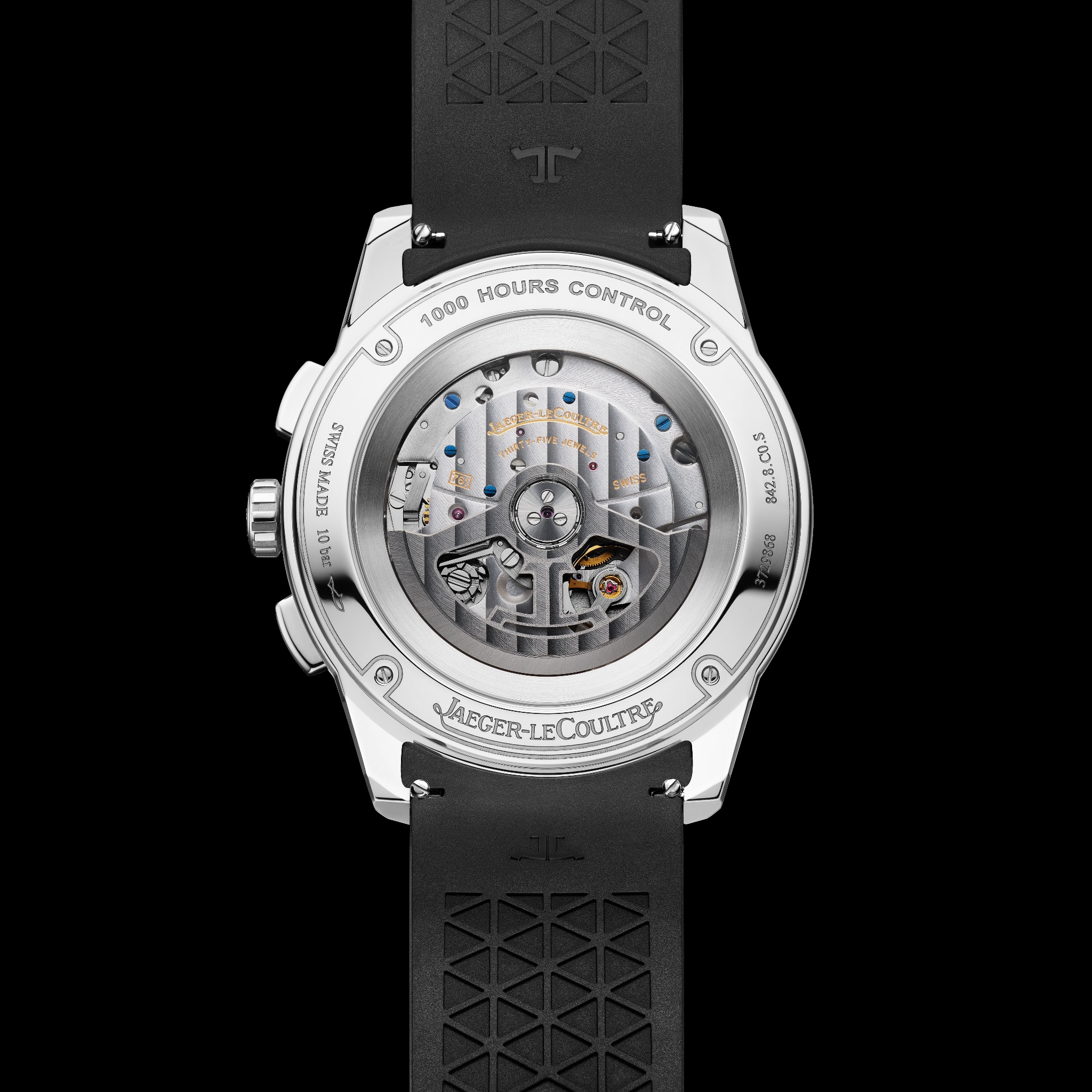 The sapphire crystal case-back reveals the automatic movement, Calibre 761 – a quintessential example of Jaeger-LeCoultre’s approach to watchmaking that combines high performance with mechanical elegance. Powered by twin barrels, the fully integrated chronograph movement features a column-wheel chronograph mechanism with vertical clutch and offers a 65-hour power reserve. The fine finishing includes blued screws and Côtes de Genève decoration on the baseplate as well as on the signature open-worked winding rotor bearing the ‘JL’ motif. The movement was designed, produced and assembled by Jaeger-LeCoultre at its Manufacture in Switzerland’s Vallée de Joux.