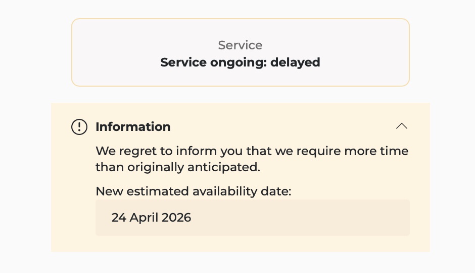 Thanks for asking about the restoration of my grandfather's watch: the service has been delayed and the new estimated availability date is 24 April.