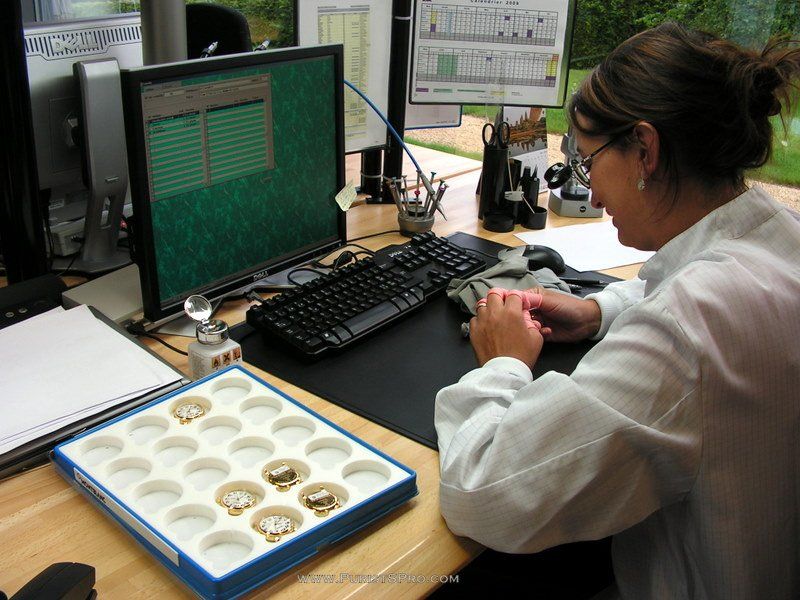Each movement is tested first being wound on the winder and then placed on the bank of automatic testers to be tested in 5 positions. Movements that do not fulfil requirements are returned.