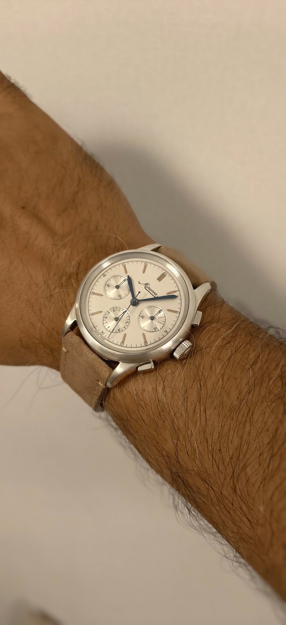 On the wrist today in sterling silver. Valjoux 71 manual wind. One of 32 pieces made circa 1997 by the Frey father and son team.