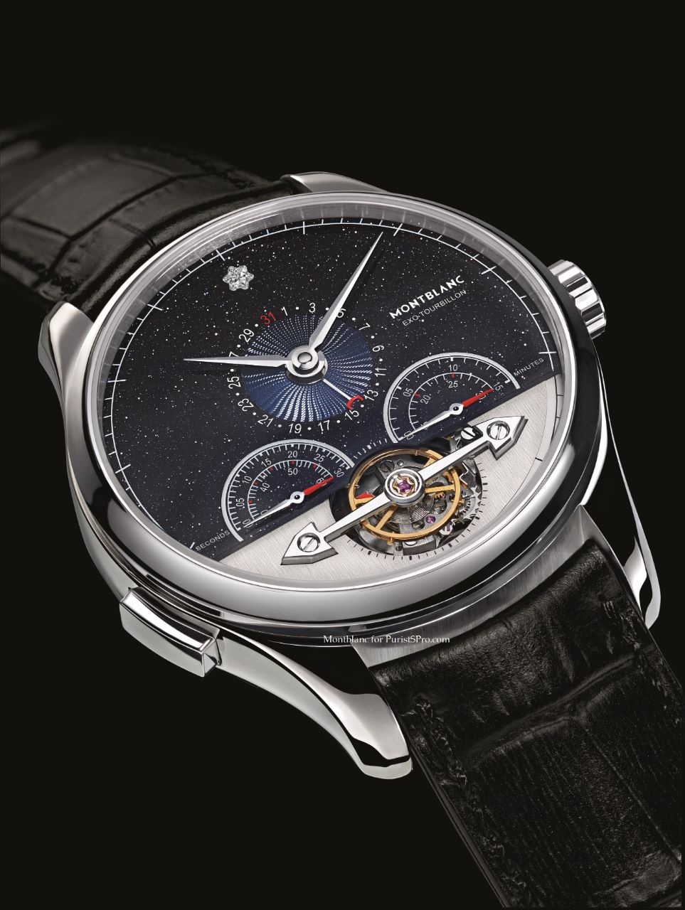 Dial: Upper part made of aventurine depicts the sky at night with the patented Montblanc diamond at "12 o’clock"and vertical satin-finished on the lower part. Rhodium-plated sword-shaped hour-hand and minute-hand, date shown by a hand with a little red crescent at its tip on a blued guilloché flinqué wave pattern decoration on off-centre dial, chronograph with two counters with silver "filets" (one counter for 60 elapsed seconds at "8 o’clock" and a second counter for 30 elapsed minutes at "4 o’clock") with double indication hands and corresponding sectorial scales 14