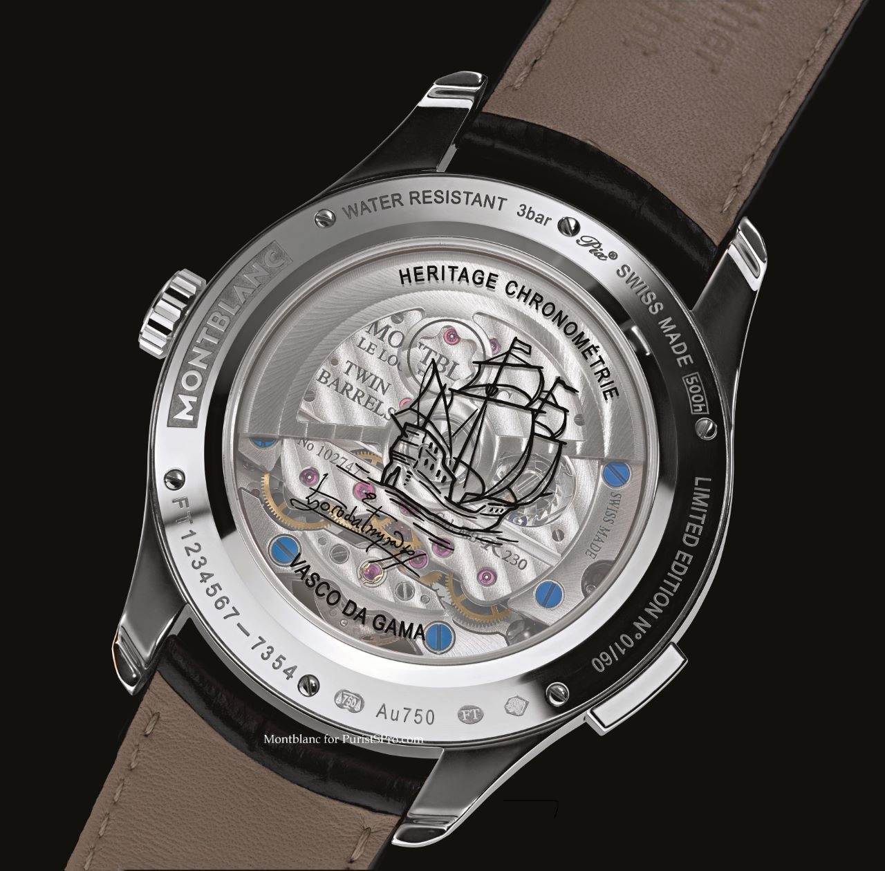 Montblanc Heritage Chronométrie ExoTourbillon Minute Chronograph Vasco da Gama Limited Edition 60 This version of the ExoTourbillon Minute Chronograph is the flagship of the Vasco da Gama Limited Editions. Each of the 60 chronographs in this strictly limited edition boasts several important artisanal refinement. Montblanc’s ticking flagship is naturally affiliated with Vasco da Gama’s floating flagship, the São Gabriel. The pane of sapphire crystal in the case back is adorned with a sketch of the historic sailing vessel, as is the signature of the intrepid discoverer and seafarer. The series is limited to 60 watches in reference to the 60-man crew of the São Gabriel. The sophisticated dial with different levels and refined finishes reflects the two complications of the timepiece. The upper part embellished with a slice of aventurine, dyed dark blue, catches the eye on the dial, where numerous small dots emulate the starry night sky in reference to the night sky of the southern hemisphere that guided Vasco da Gama on his voyage. A diamond in the patented cut in the shape of the Montblanc emblem sparkles at 12 o’clock. A wave-shaped guilloché, designed in flinqué style and coated with blue paint, in the centrally positioned hand-type date display refers to the nocturlabium (star clock), which was one of the navigational instruments aboard the São Gabriel. The dial’s lower level is satin-finished and unveils the intricate construction of the ExoTourbillon at 6 o’clock. This exceptional timepiece is available in a 44-mm white gold case
