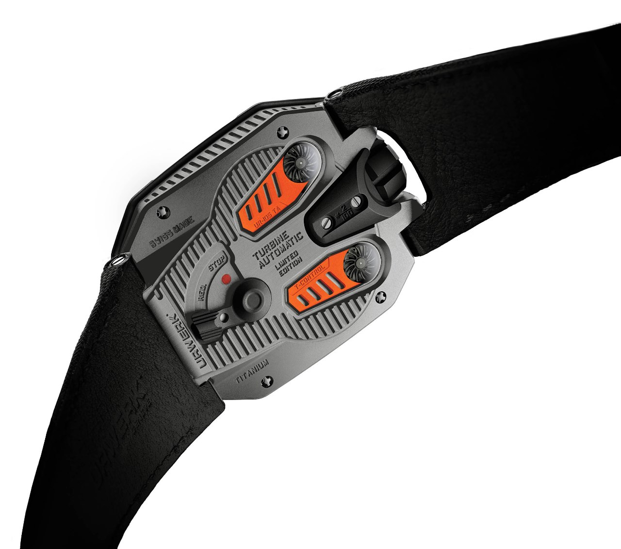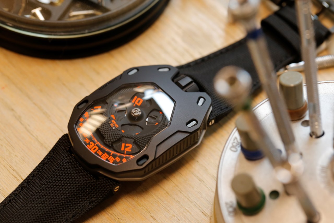 Materials: UR-105 TA "Clockwork Orange"- black PVD titanium case, black PVD steel bezel