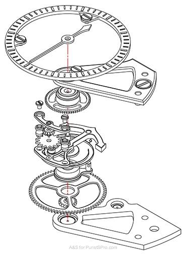 To maximize power consistency in the Constant Force Tourbillon, Arnold & Son began at the beginning, i.e. the mainspring barrel, as this is the source of the movement's power. Instead of using just one mainspring barrel, which would produce significantly different amounts of torque between fully wound and nearly empty, the Constant Force Tourbillon has two symmetrical barrels in series, visible dial side at 10:30 and 1:30. The first mainspring barrel alone powers the gear train, while the second barrel tops up the first whenever its torque output drops below optimal. This ensures that the power to the regulator flows as constantly as possible.