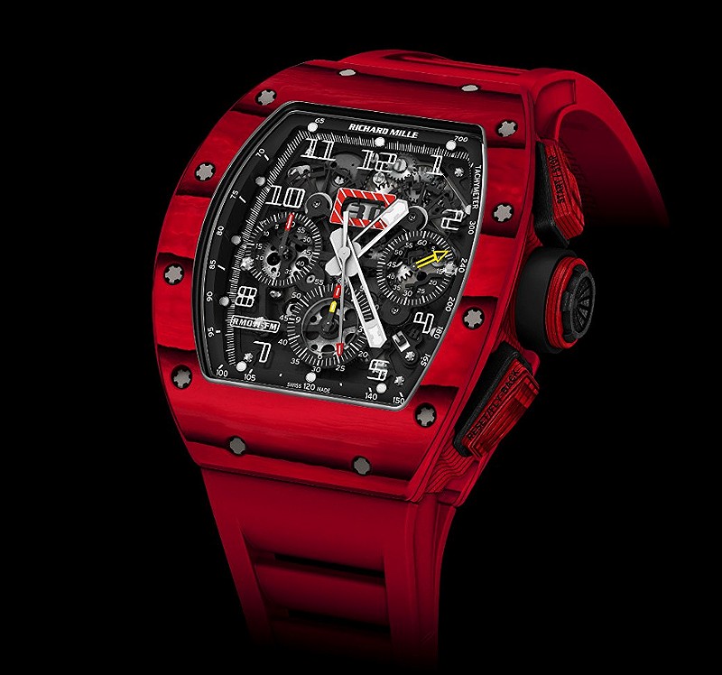Coupled with its RM 011 automatic flyback chronograph caliber, Richard Mille presents the latest incarnation of its TPT® quartz case dressed in vibrant red. A unique color in fine watchmaking, it redefines the graphic limitations of this material.