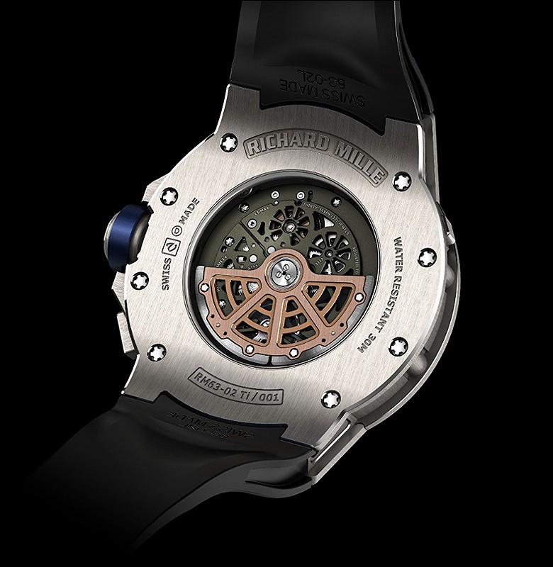 Producing the RM 63-02 case is an extremely complex task, as almost 200 parts are required to create it. The design and creation of the watch are both fruits of an overall conceptual approach applied to the case, dial and individual movement parts. Its four-part construction includes the rotating bevel that, in addition to being used to adjust the watch, plays a role in keeping the timepiece water-resistant. The case mechanism is completed by horns and screws to securely fix the strap.