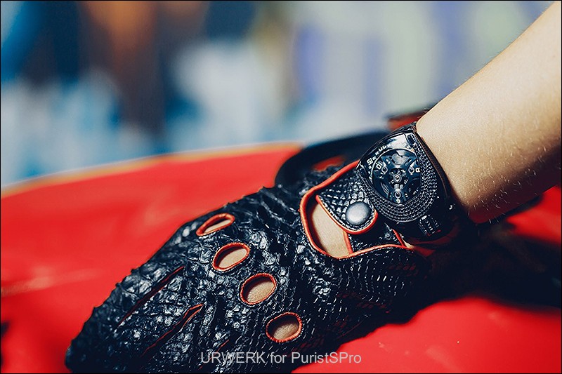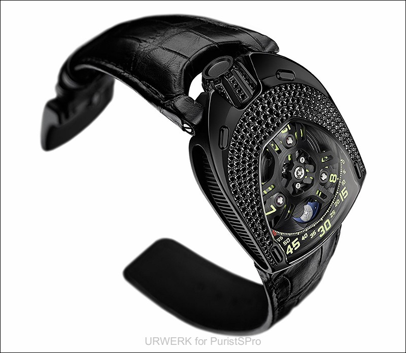 UR-106 Black Lotus: steel case and titanium crown, PVD coated in black, set with black diamonds, titanium caseback PVD coated in black (limited edition: 11 pieces)