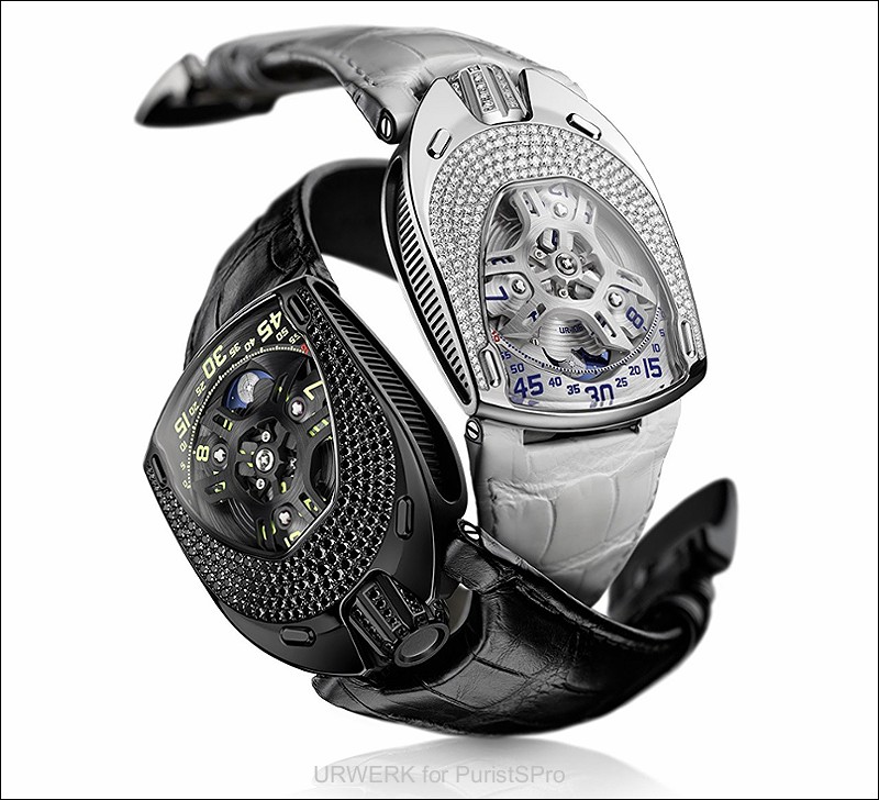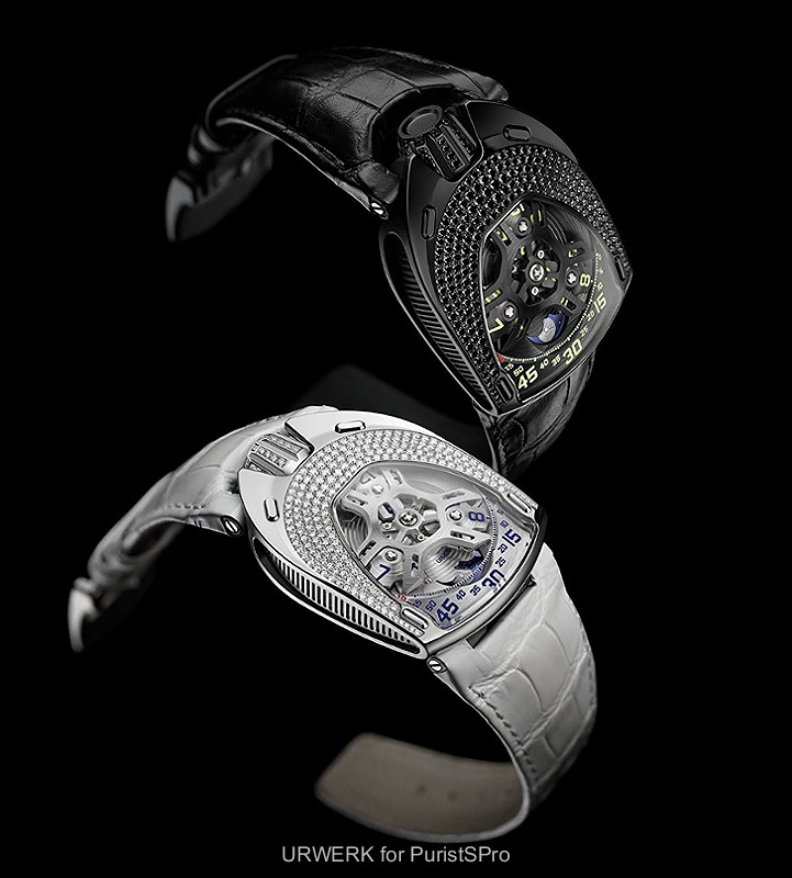 The UR-106 “Lotus” comes in two versions: one is in titanium and steel with diamonds on the bezel, crown and buckle; its antithesis is in black PVC-coated titanium and steel set with black diamonds. “We confronted the two aspects of the same watch — light on one hand and darkness on the other,” enlarges Martin Frei. “We are all creatures of light, but it is our shadows that complete, and define who we are. Tangible dualities are qualities essential to understand the nature of things. In darkness and light, the UR-106 “Lotus” is a double watch.”