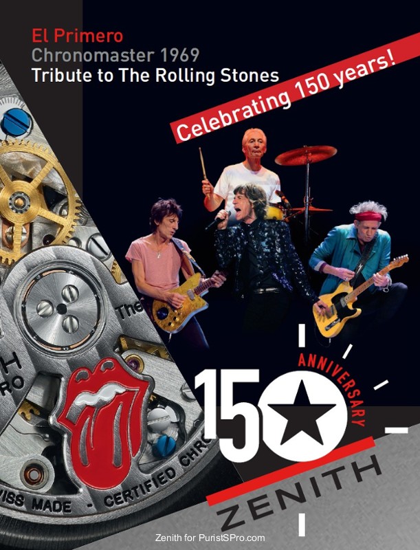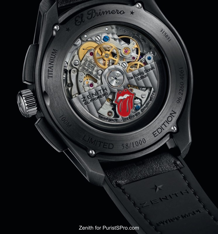 In 1865, the small Swiss village of Le Locle in the Neuchâtel mountains was home to 3,000 farmers. When winter came, they made a living by exercising various watchmaking trades, each in their own separate way. Georges Favre-Jacot, a youthful entrepreneur barely 22 years of age, had the brilliant idea of bringing these talents under one roof in order to produce watches in their entirety and facilitate the relevant processes. Within just a few years, he thereby built one of the first industrial watch Manufactures in the modern sense of the term. Favre-Jacot was an innovative visionary who revolutionised the manner of taming time and instilled in his employees an enterprising spirit that has become a Zenith tradition. This was the very spirit that would inspire the Manufacture Zenith over the subsequent century and half to register 300 patents, create more than 600 movement variations and win 2,333 prizes in the field of chronometry: an absolute record. It was also this spirit that led in 1969 to the emergence of the world’s first integrated automatic chronograph movement, beating at the exceptional frequency of 36,000 vibrations per hour: the El Primero chronograph calibre, an acknowledged benchmark to this day. This movement has since given rise to an entire collection and powers a number of timepieces from the Manufacture. Zenith naturally wished to celebrate its friendship with rock’n’roll legends – The Rolling Stones – by crafting a modern watchmaking legend. It has done so by creating a new version of the El Primero Chronomaster 1969 Tribute to the Rolling Stones, this time issued in a 1,000-piece limited edition.