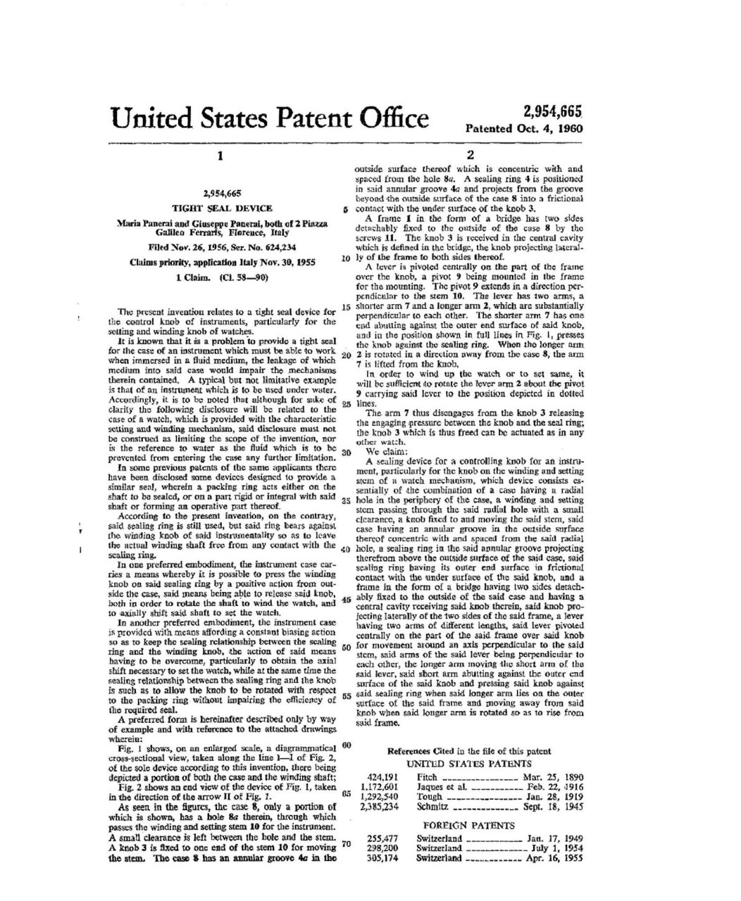 At Panerai in Firenze, based on designs, sketches, and internal documents, many believe that the adoption of this device was made in the first half of the 40s, during the Second World War. It is not understood why the patent of this clever and effective device was deposited only ten years later.