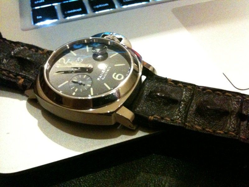 It's a black horn-back Alligator strap. It's a little bit smaller than I thought, so I will need to punch one more hole on the strap. But I'm very happy with the new look of my 104.